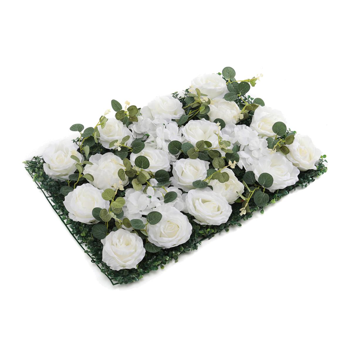 Transform your space into a vibrant, vertical garden with this stunning artificial flower hedge panel. Featuring a beautiful mix of Milanese eucalyptus cream roses, white flowers, and round-leaf plants, it offers a lifelike, vivid appearance that brings natural beauty indoors. The panels are securely fixed to a durable plastic back, ensuring long-lasting aesthetic appeal. Add lights for a more atmospheric effect, and instantly breathe new life into any dull space. Perfect for walls, columns, and more.