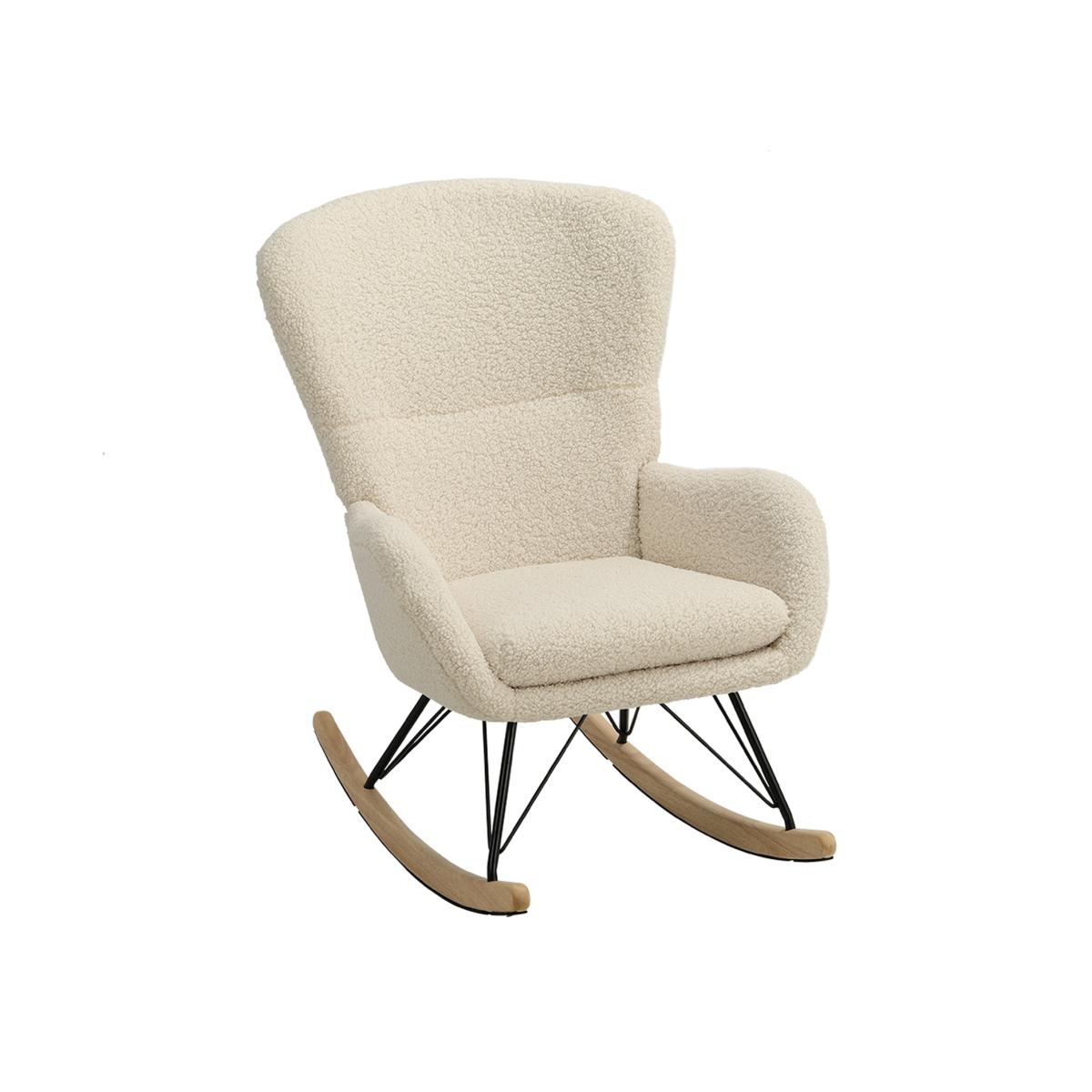 HomeScape Collective - Elevate Your Space. Introduce this elegant rocking chair to your home and delight in how effortlessly it complements your existing decor. Ergonomically crafted to offer optimal support as you gently rock, it features luxurious faux wool upholstery and plush sponge cushioning for cloud-like comfort, inviting you to unwind. The sturdy solid wood runners, fitted with rubber pads, ensure silent gliding while protecting your floors. Thoughtfully designed low armrests on either side encourage complete relaxation, making this chair a cosy haven for moments of tranquillity.