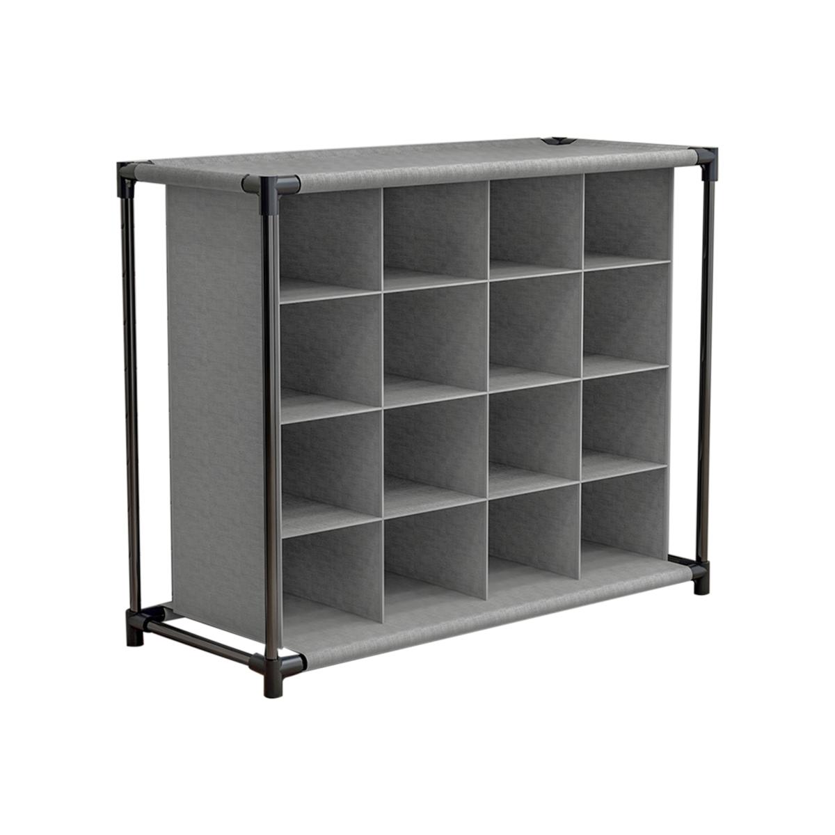HomeScape Collective - Elevate Your Space. Effortlessly stay organised with this functional solution that keeps your shoes neat and your space clutter-free. Featuring an efficient 4-tier, 16-grid layout, this shoe rack provides ample space for shoes of all sizes and types. Each pair has its own dedicated slot, keeping your shoe collection tidy. The smart open-grid design allows for easy visibility, helping you find your desired pair in seconds. The top section offers a convenient space for keeping other items organised and easily accessible. Compact and lightweight, this shoe rack is easy to move and reposition whenever needed. The neutral grey fabric, paired with a black frame, complements various home decor styles.