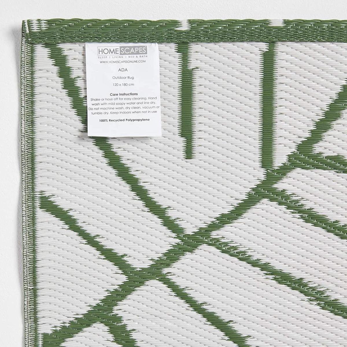 Add some style to your garden or patio area with this large garden rug from Homescapes. In grey and white, this decorative outdoor rug has a distinctive geometric pattern and has been woven from 100 recycled polypropylene. An eco-friendly rug made from waste plastics, this large outdoor rug is lightweight and waterproof making it ideal for all weathers and spaces. Ideal for decorating patio, decking and slabbed areas, outdoor rugs are also perfect for picnicking, camping or even on the beach. Simple and easy to clean, simply sweep away dirt or gently wash with mild soapy water. Part of an exclusive range of garden rugs available in several striking designs. From Homescapes range of garden ornaments and accessories, this grey outdoor rug will brighten up your garden living areas. Available in 2 sizes, it is the perfect gift for any new homeowner or keen gardener. When you first open your rug, we recommend laying it front side down for a few hours for it to sit flat. Turn your rug regularly to ensure even wear and reduce pressure marks from furniture. If using indoors, you may wish to use an anti-slip mat underneath to prevent the rug from slipping out of place.