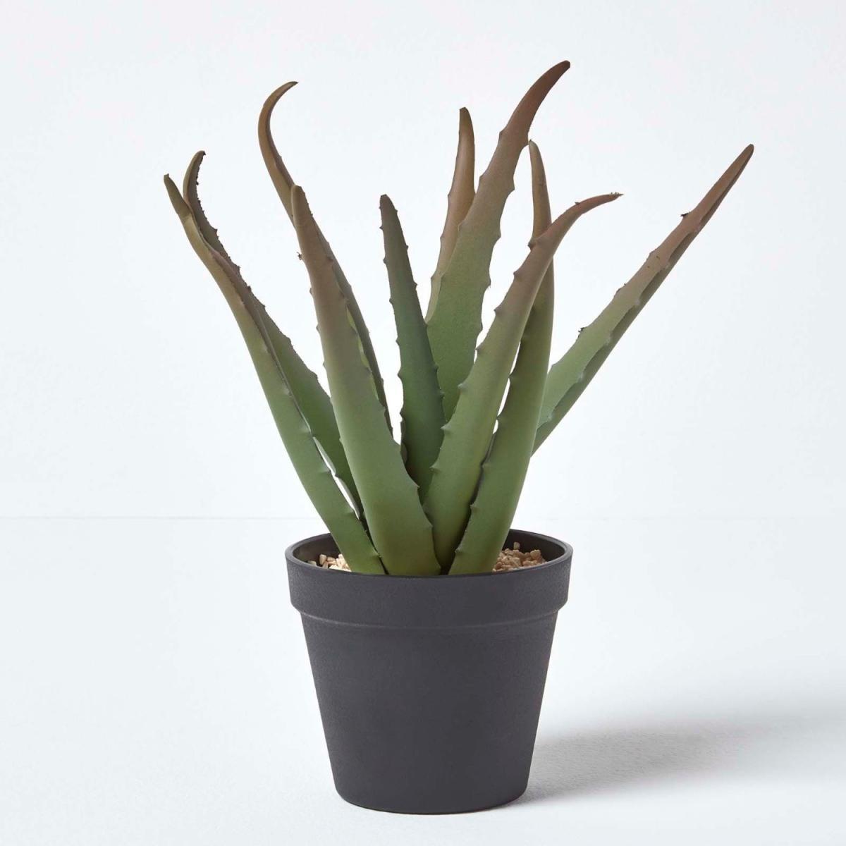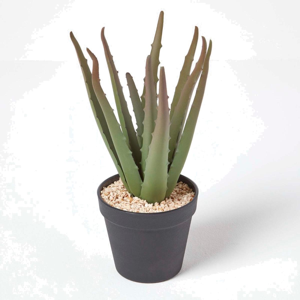 30 cm tall potted artificial Aloe Vera plant in black plastic pot with faux gravel, a medium sized artificial plant that introduces a contemporary looking into a home or office. This decorative plant can be placed into a colourful vase to suit your interior style. Part of Homescapes' collection of artificial succulent and cactus plants, one of the largest collections in the UK, each plant is handcrafted by skilled designers resulting in a truly botanically accurate plant that is just like the real thing. Resembling the iconic aloe plant, each leaf is hand cut from a strong, UV treated polyfoam that has been coloured green and burgundy tones, the leaves can then be manipulated into your desired look. Designed to be used as an indoor decoration, the faux plant is UV treated for lasting colour and protection. It is recommended that it is kept out of direct sunlight and dusted with a dry cloth regularly.