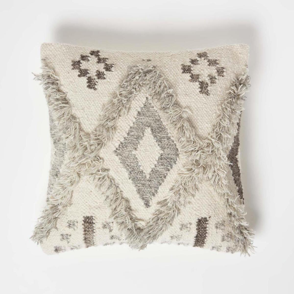 An exclusive collection of colourful and neutral, traditionally handwoven kilim cushions from Homescapes. These durable, hardwearing cushions are woven from a luxury cotton and pure wool blend that creates a tapestry-style cushion, perfect for everyday use. Featuring a traditional textured design that echoes Indian, goemetric and tribal patterns, these colourful cushions are sure to make a statement in any home. Filled with a super soft hypoallergenic super microfibre cushion insert, these heavy-weight cushions are both practical and comfy and will not flatten over time. A range exclusively designed by Homescapes, each cushion cover is expertly handwoven on traditional handlooms, resulting in a truly unique cover each and every time. Using the finest quality fair-trade cotton and wool, each colour has been dyed using natural dyes and finished to the highest standards. Insert Included. Spot Clean only. Complementary kilim rugs, pouffes and home accessories are also available from Homescapes, sold separately. All images are representative of the kilim pattern and colours, however, due to the handcrafted nature of kilim, each cushion design may differ slightly.