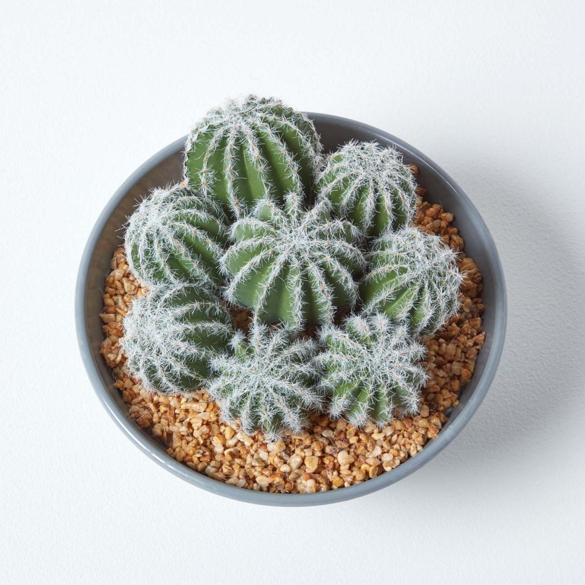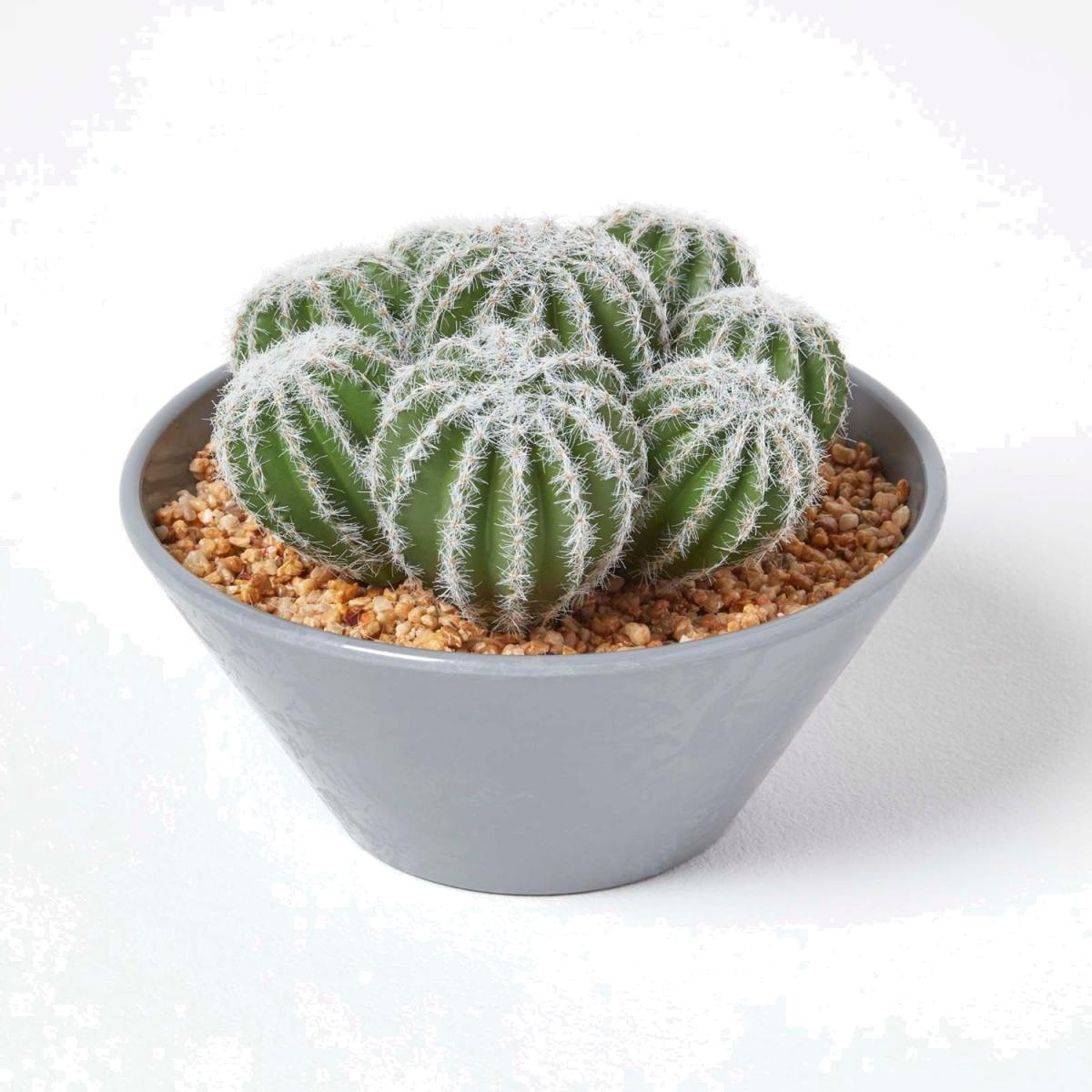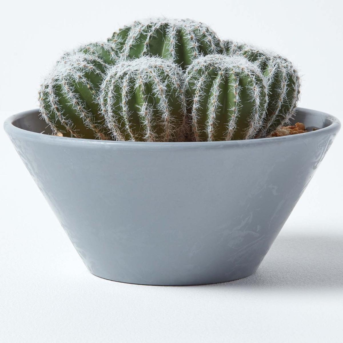 Artificial barrel cactus arrangement in grey plain melamine pot. From Homescapes' faux plant, flower and tree collection, one of the largest top quality artificial plant collections in the UK, this decorative accessory is hand crafted by skilled experts. Consisting of a cluster of round barrel cacti planted in a pot of faux gravel, each cactus has been carefully crafted from a UV treated polyfoam and decorated with lifelike needles and spines. Measuring 17cm tall and 20cm in diameter, it is the perfect table top decoration, ideal for the office or living space. A truly lifelike, low maintenance display cactus that will decorate your home for years to come, it is potted in a decorative plain grey round melamine bowl that will compliment contemporary style living spaces. Cactus is designed for indoor decoration, to care for your plant it is recommended that it is kept out of direct sunlight and dusted with a dry cloth.