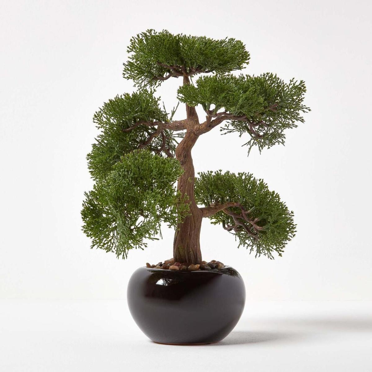 Create a zen atmosphere in your bedroom or office with Homescapes' faux bonsai tree. Adding oriental style to your interiors, this artificial bonsai tree is potted inside a decorative ceramic black pot, which has a glossy look to add style to your home dcor. Complete with faux soil and pebbles for a truly realistic look, this bonsai tree has been carefully handcrafted to ensure that it looks realistic and just as good as the real thing. Homescapes are a leading retailer of realistic and lifelike artificial plants with many more plants to choose from including a larger bonsai tree. Keep out of direct sunlight and wipe away dust with a soft cloth. Pack includes one bonsai tree.
