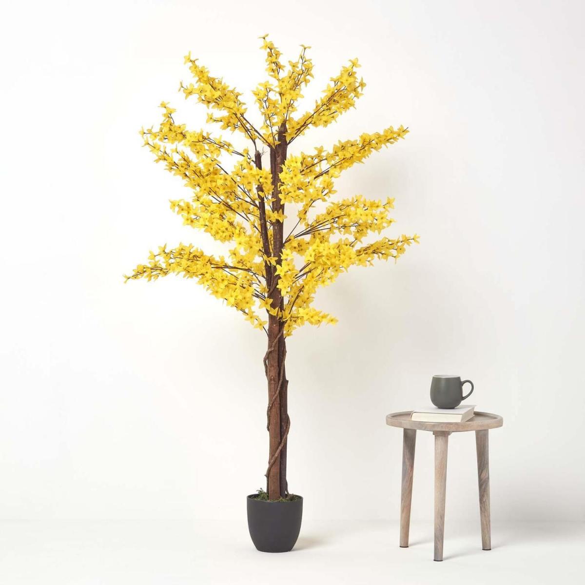 Homescapes 5 foot tall, yellow Forsythia tree is the perfect addition to lighten up your home. Made from real wood and silk flower petals, this artificial flower will add colour and style to any living space and can be used in your home, office or even used for decoration at weddings. An array of brightly coloured, yellow petals, this life like potted plant requires no maintenance or watering, making them the ideal decorative solution for those who struggle to look after real plants. Artificial plants should be placed away from direct sunlight to avoid discolouring.