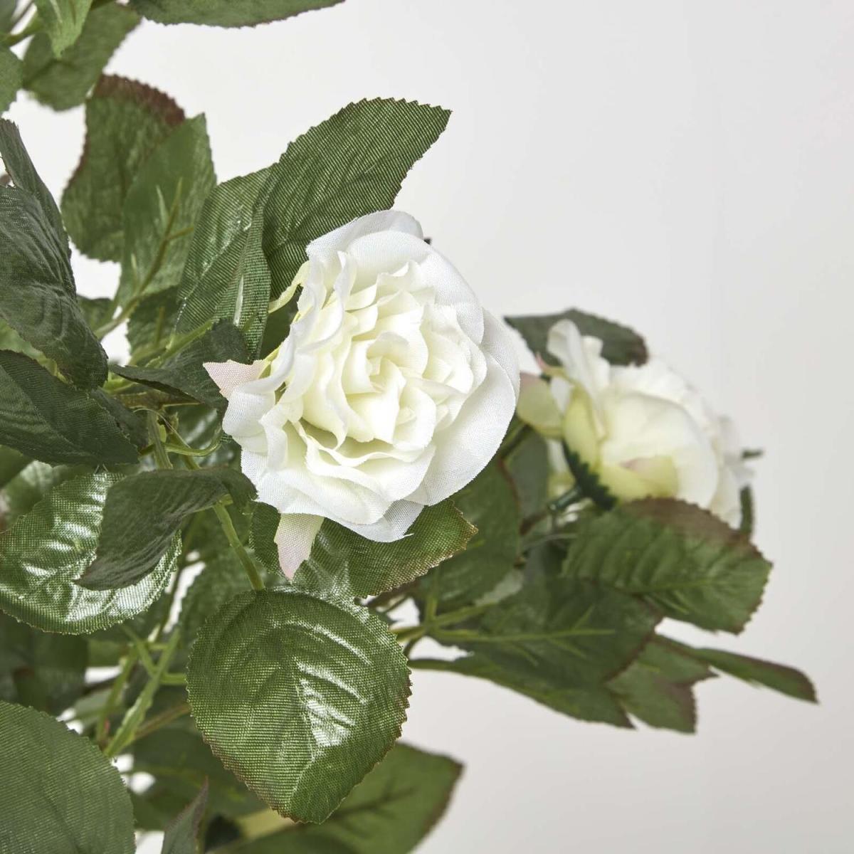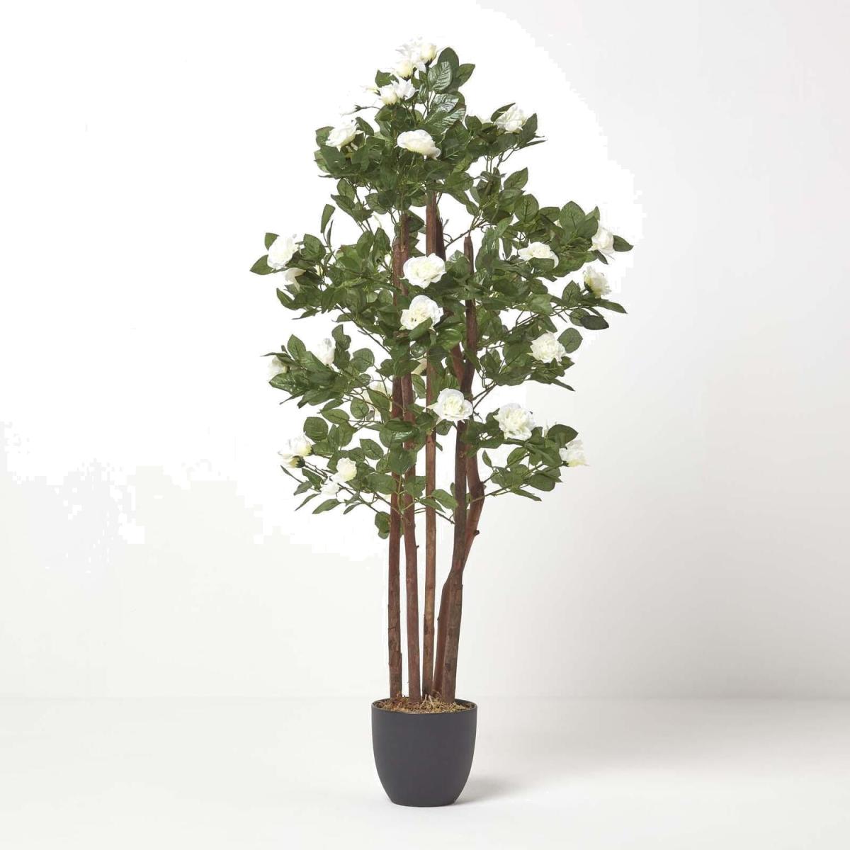 Measuring over 4 feet tall Homescapes artificial white rose tree will add elegance and style to any home, designed to mimic a genuine rose plant this tree features silk rose buds and an abundance of dark green serrated edge rose leaves, all potted into a versatile black pot. A beautifully designed decorative plant, Homescapes white rose trees are ideal for weddings, birthdays and special occasions, adding style and opulence to a celebratory event, these large rose trees will look perfect lining the aisle of a church or walk way.