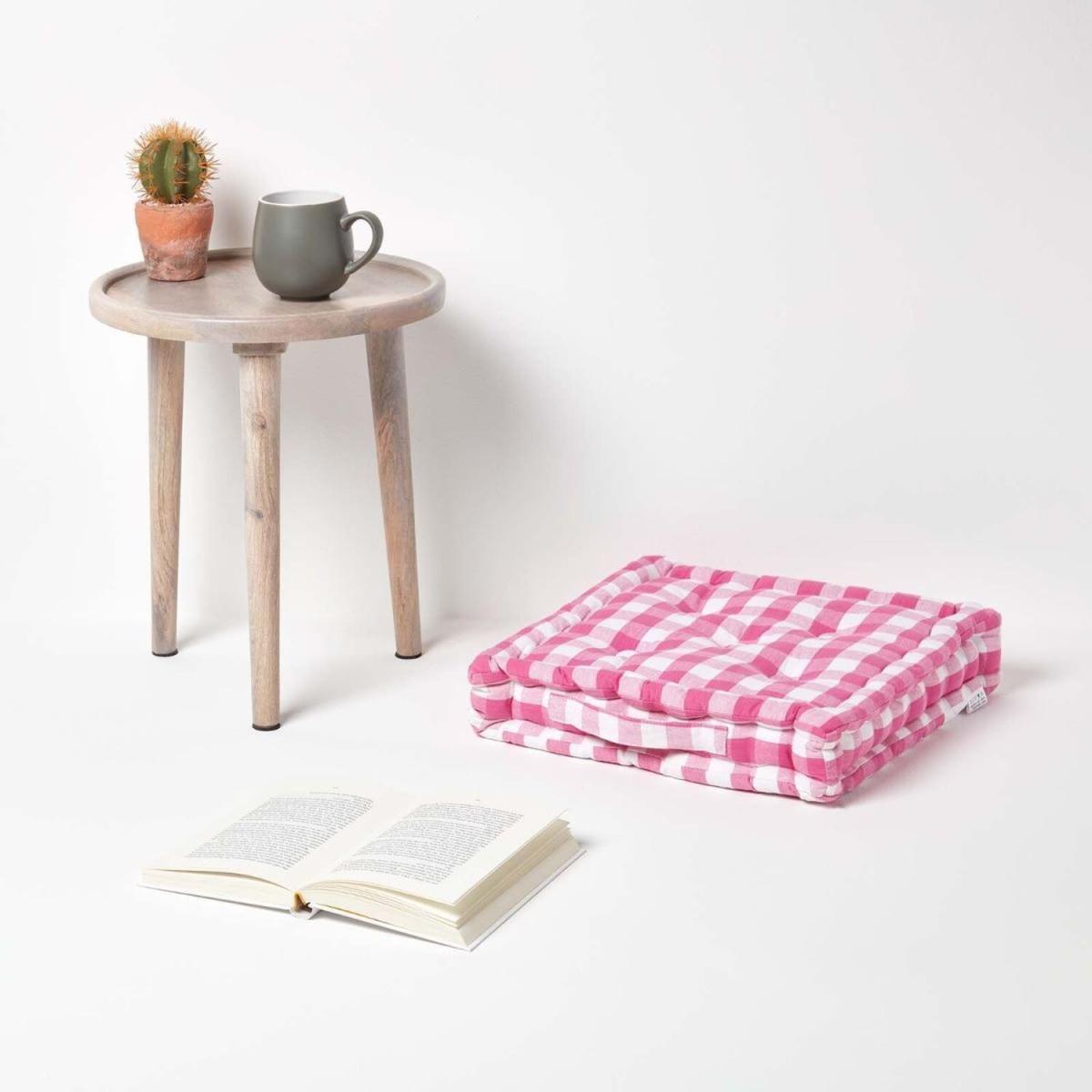 Homescapes square floor cushions are manufactured with cotton fabric and filled with high quality resilient fibres. These cushions coordinate beautifully with the other Homescapes soft furnishings like throws, cushion covers, kitchen textiles and curtains in the same or similar designs and fabrics. The selection is huge and the quality is top class. These cushions can be used as chair pads, seat pads, dining booster cushions, children cushions and garden seat cushions. Since the fabric is not waterproof, please do not leave them outdoors. The range includes a large selection of plain colours, thick and thin stripes, beautiful floral and retro prints and also classic woven tartan checks.