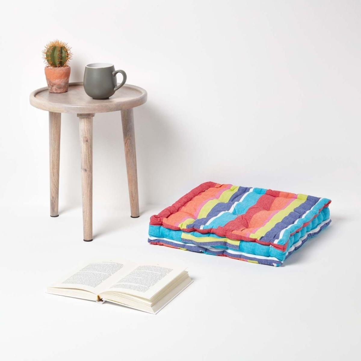 Homescapes square floor cushions are manufactured with cotton fabric and filled with high quality resilient fibres. These cushions coordinate beautifully with the other Homescapes soft furnishings like throws, cushion covers, kitchen textiles and curtains in the same or similar designs and fabrics. The selection is huge and the quality is top class. These cushions can be used as chair pads, seat pads, dining booster cushions, children cushions and garden seat cushions. Since the fabric is not waterproof, please do not leave them outdoors. The range includes a large selection of plain colours, thick and thin stripes, beautiful floral and retro prints and also classic woven tartan checks.