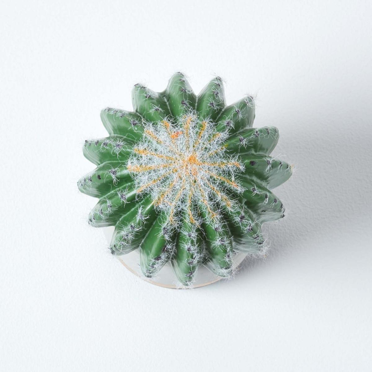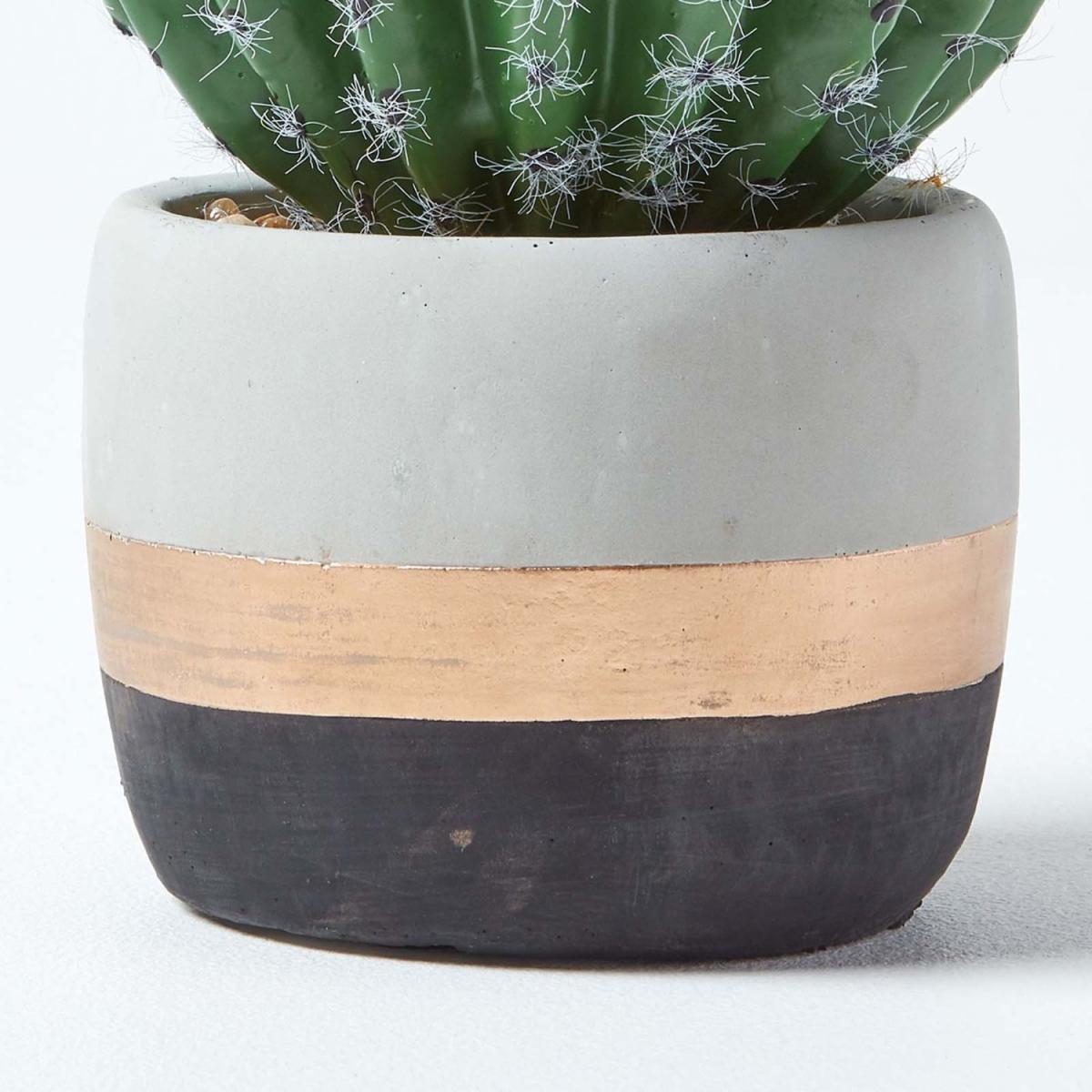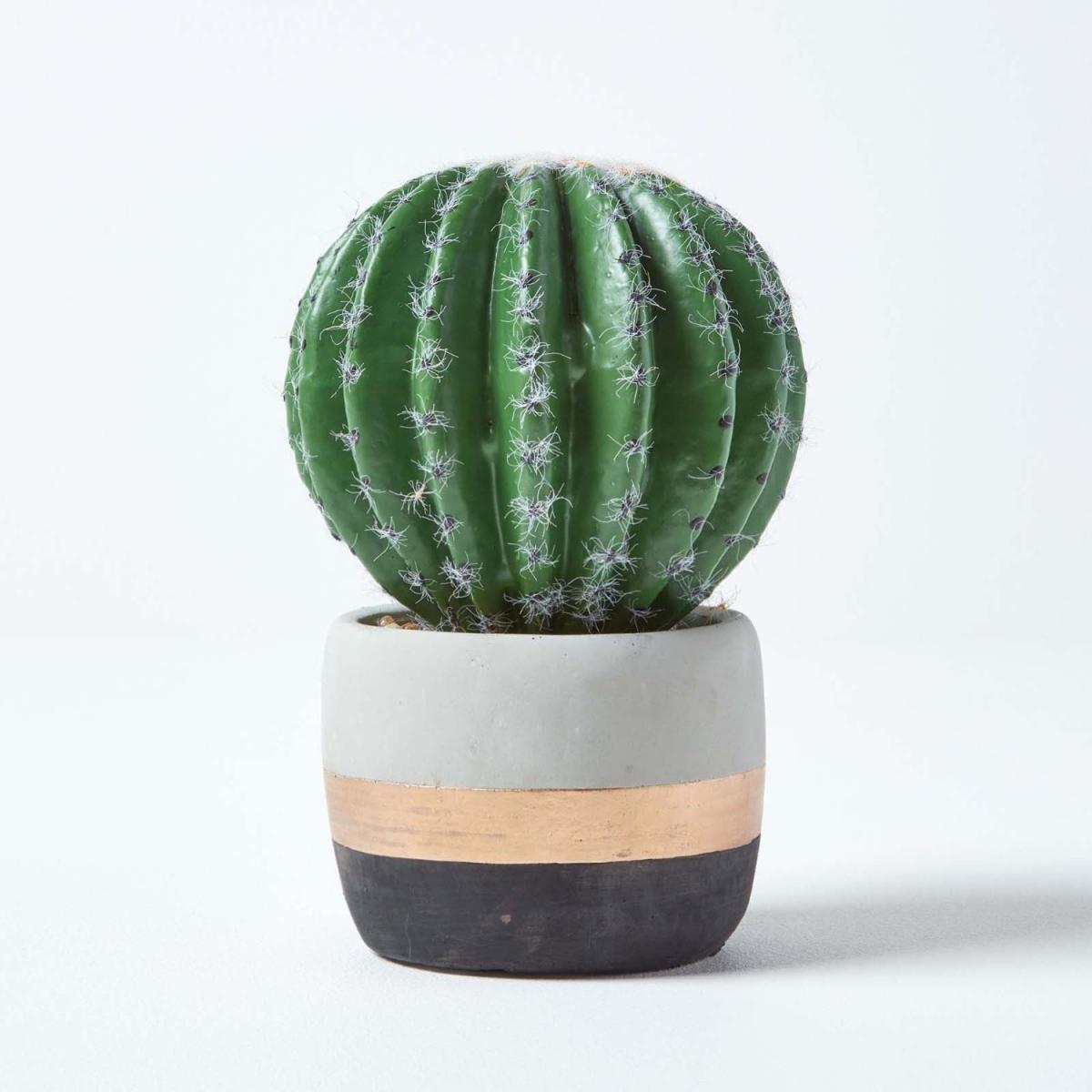 Round decorative cactus measuring 19cm tall, this artificial cacti is ideal for decorating office desks, side tables and coffee tables and will introduce a modern desert style into any room. This large round faux Echinocactus is handcrafted from a sturdy and lifelike polyfoam that has been decorated with replica white spines and sits in a contemporary style pot. Ideal for living room and bedroom decoration the equally beautiful gold grey and black striped pot will compliment many décor styles. From Homescapes collection of luxury artificial succulents and faux cacti, Homescapes offer one of the biggest ranges of artificial potted plants and trees in the UK with all ranges exclusively designed by them. This cactus plant has been UV treated for a lasting colour, it is recommended that it is kept out of direct sunlight.