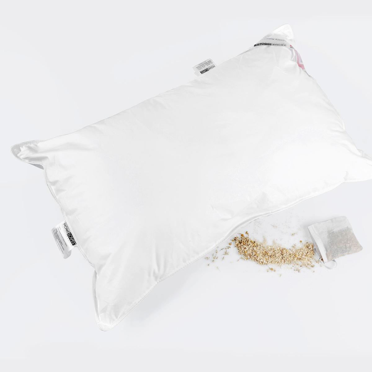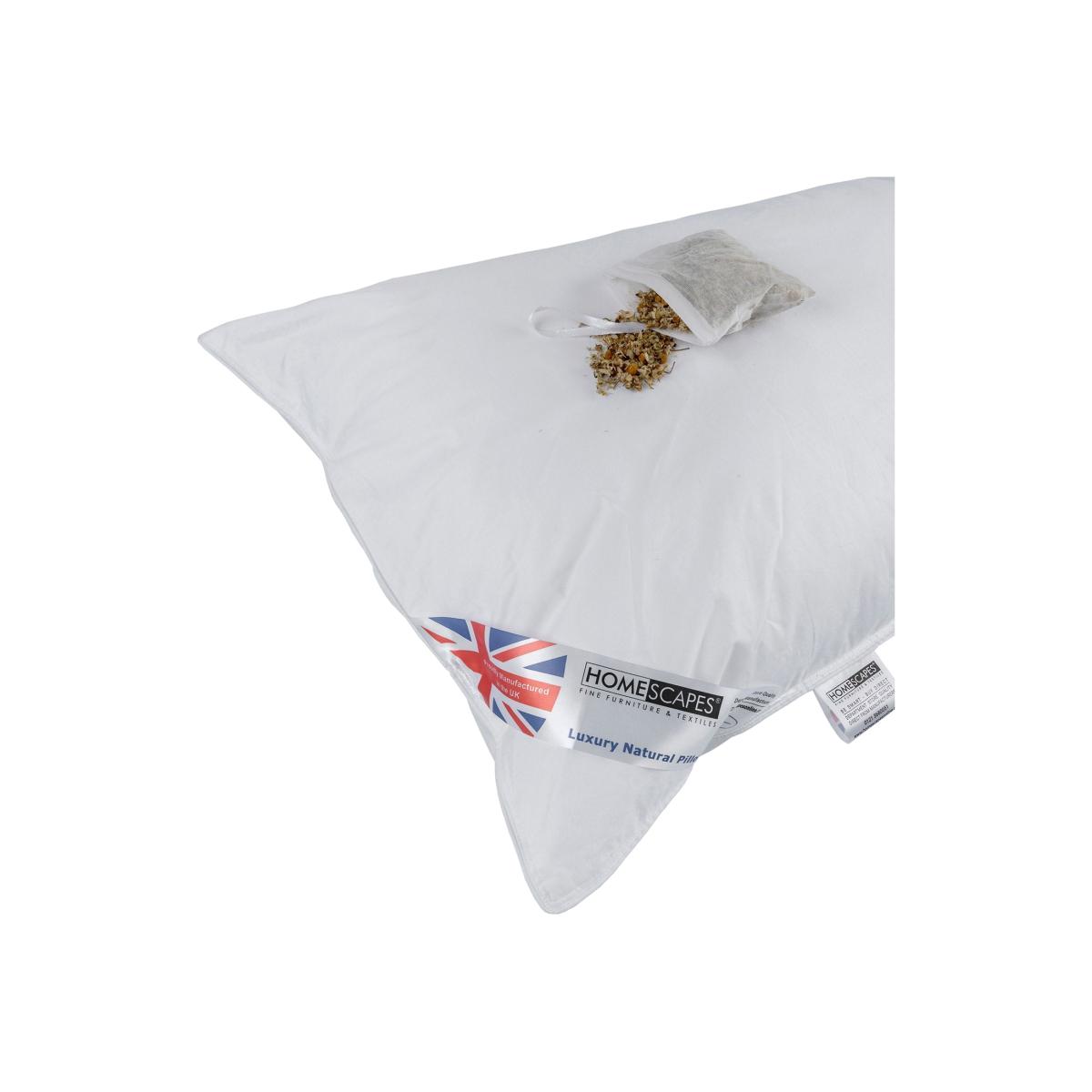 Relax and unwind with this camomile scented extra filled Goose Feather and Down pillow from Homescapes. Camomile Insert For troubled sleepers, or simply for those who enjoy relaxing before night, this pillow comes infused with the calming scent of camomile. Known for its soothing and healing properties, the camomile scent infused in this pillow (via an accessible pouch) encourages relaxation and can even aid depression and insomnia. Goose Feather and Down Pillow Our luxury Goose Feather and Down pillows combine soft cushioning with great support for your neck and shoulders. Extra filled with white feathers and down, this pillow is perfect for those who prefer a firmer and taller pillow.
