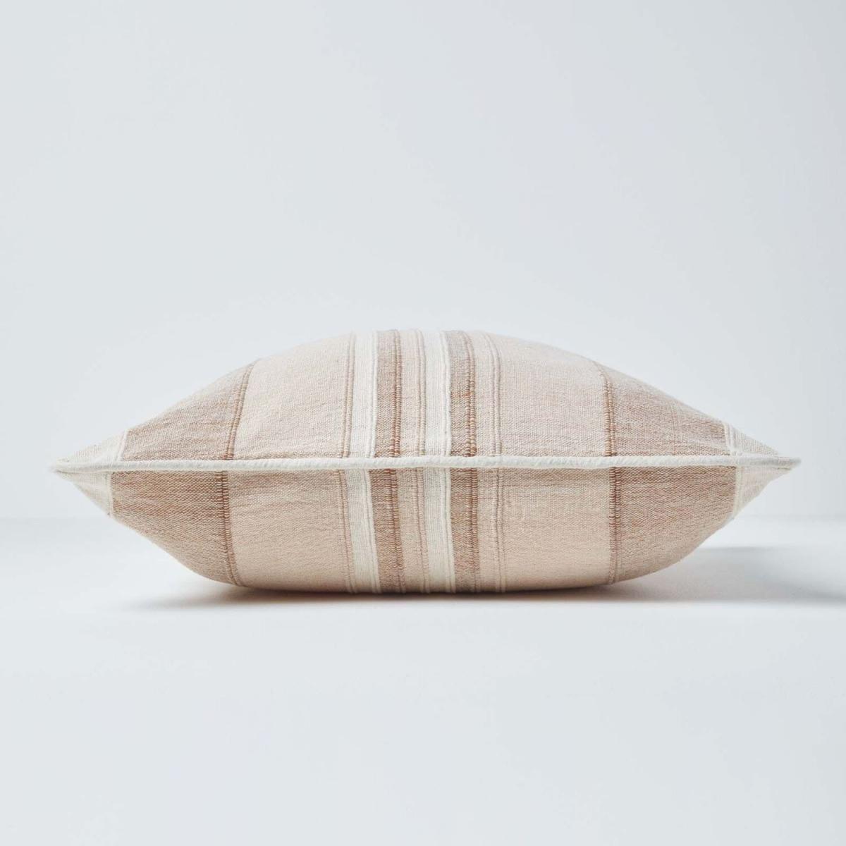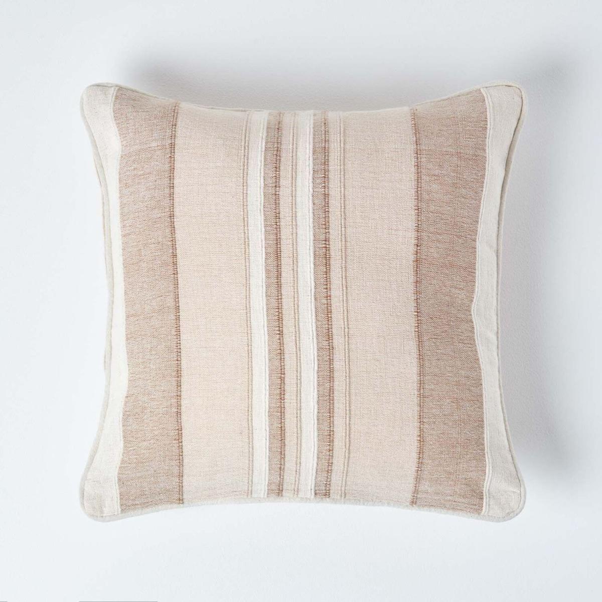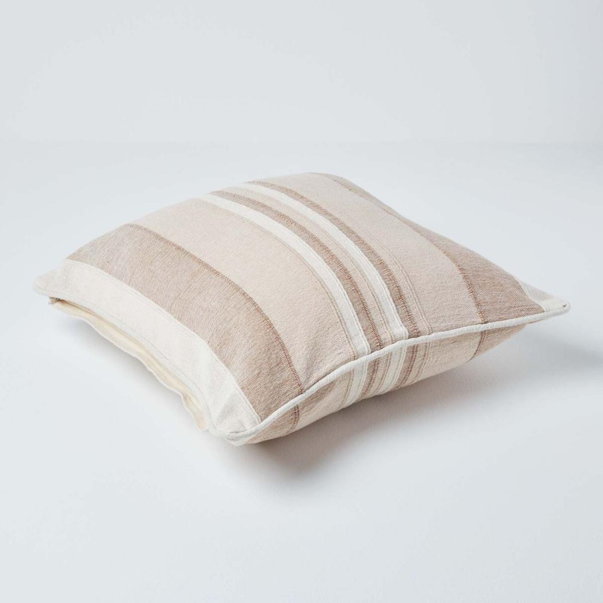 I love the simplicity and versatility of this cushion cover. Its cotton fabric and understated beige tones make it a great addition to both relaxed and more refined interiors. It works particularly well in neutral schemes or layered with textured fabrics and other patterned cushions for a balanced, styled look. The striped design adds visual interest without overwhelming, making it suitable for living rooms, bedrooms, or even outdoor seating areas that embrace a cozy, casual aesthetic. For practical styling tips, consider pairing it with plain, textured throws or mixing with other natural fibre pieces to create a warm, inviting space that feels thoughtfully curated.