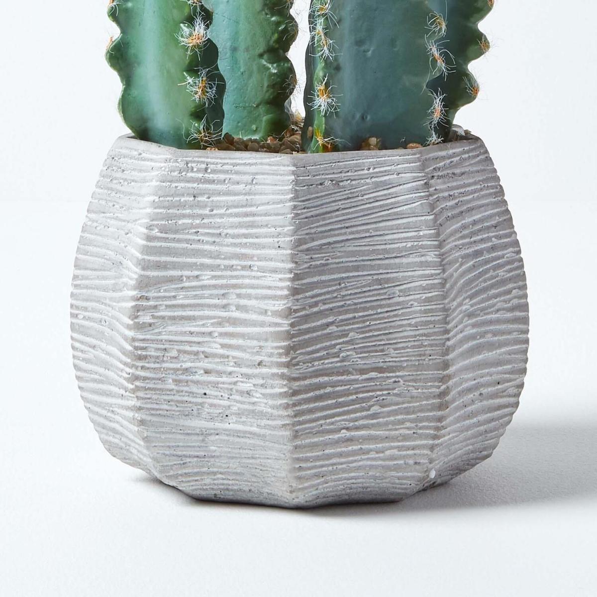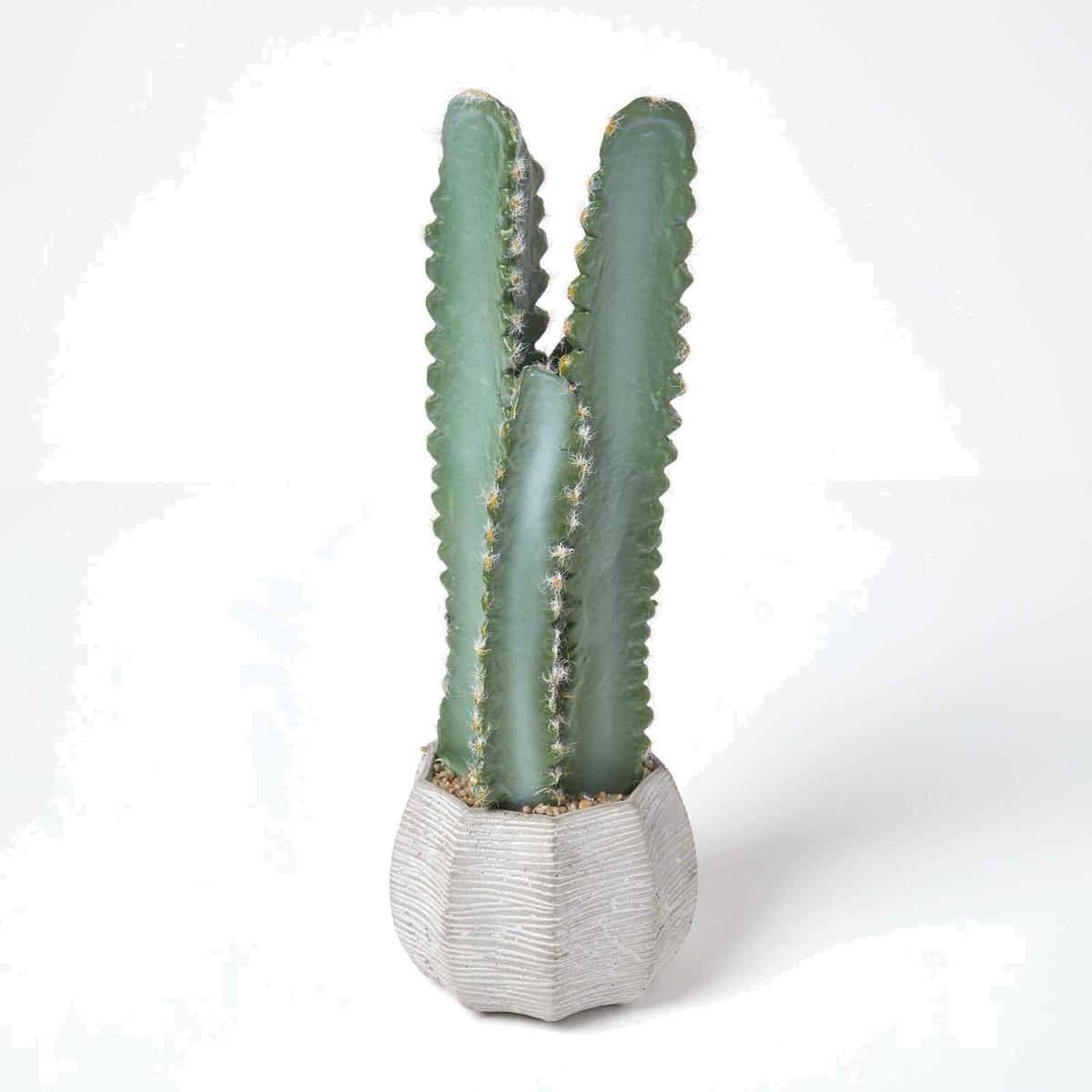 Tall decorative Hylcocereus cactus plant, potted in a decorative stone pot. This quirky style cacti features 3 cactus heads of varying sizes and measures up to 49cm tall. UV treated for lasting colour, it is suitable for indoor decoration it is ideal for office desks, coffee table or window sill dcor and has been expertly crafted from a polyfoam, ensuring lasting shape and lifelike rigidity. Potted in a decorative light grey stone pot and surrounded by faux gravel, it will introduce a calming desert style into any home or office. From Homescapes collection of artificial cacti and succulents, Homescapes have one of the UKs largest range of artificial plants and trees with all ranges exclusively designed and made by them. To care for your cacti it is recommended that it is wiped clean and dusted regularly.