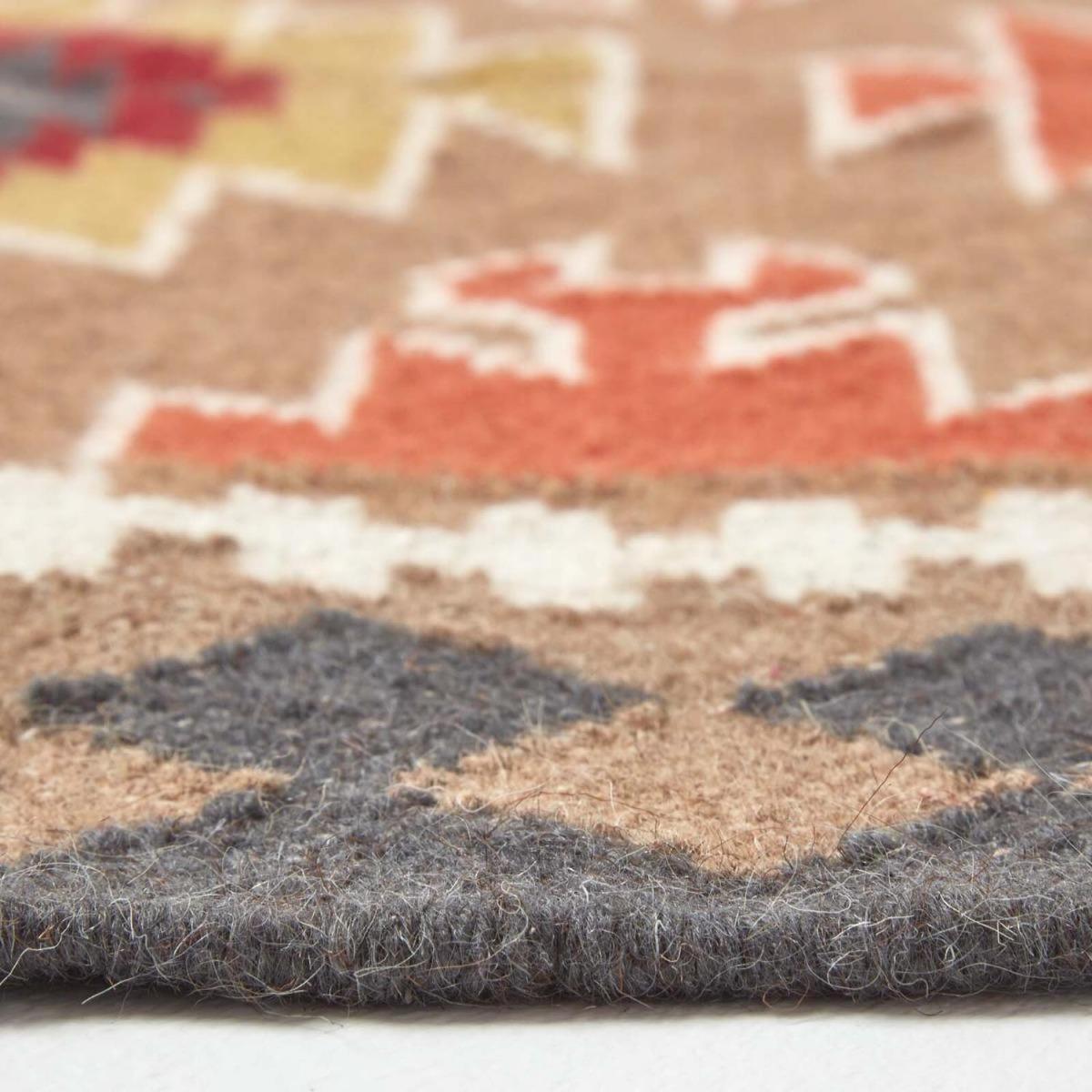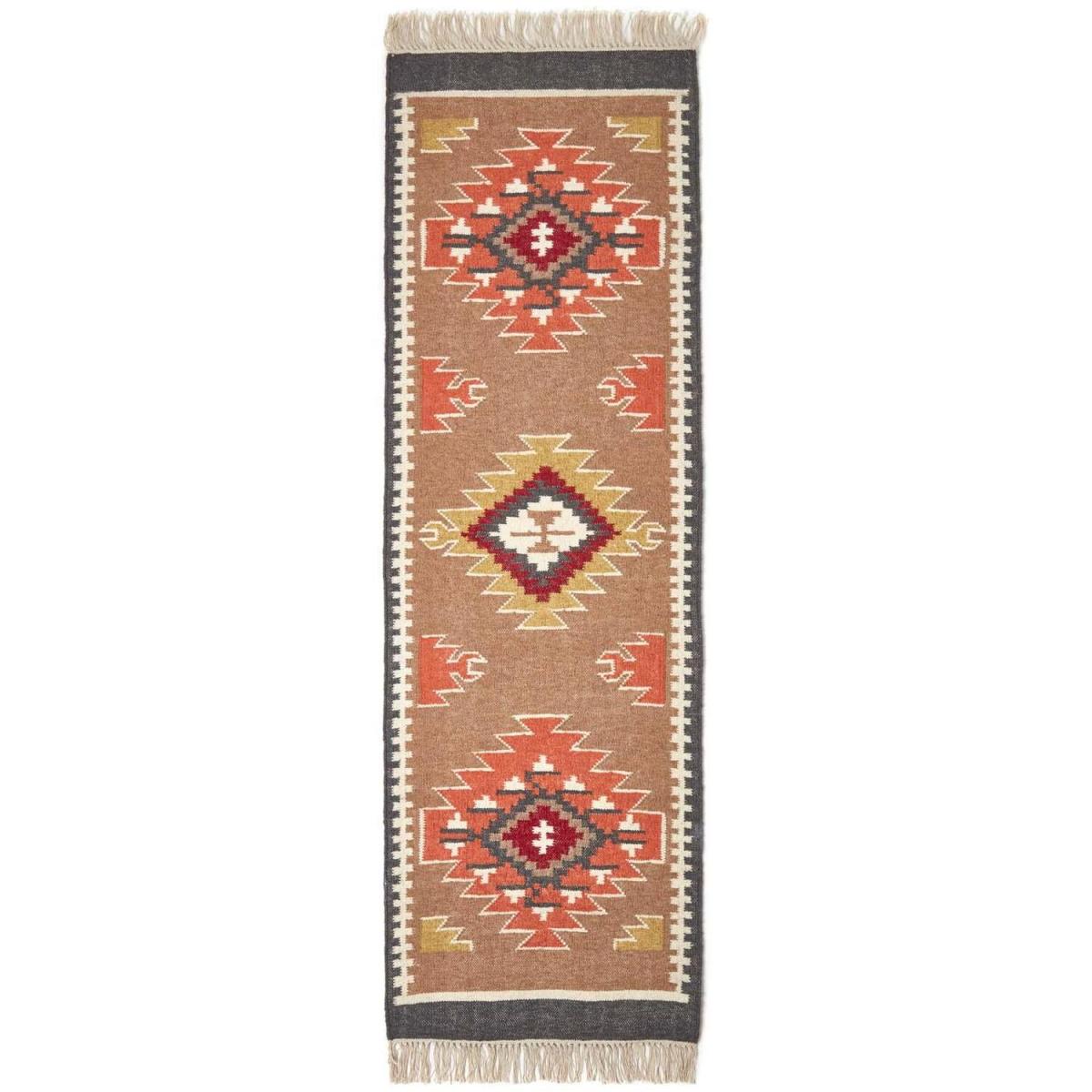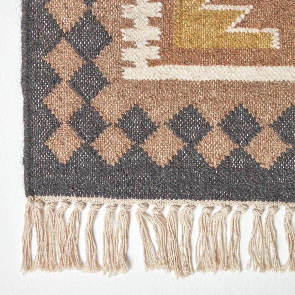 Add warmth and texture to your home interiors with the Jaipur rug from Homescapes. With a traditional design, the Jaipur rug will compliment hardwood furniture and warm neutral tones in your home. Made up of brown, yellow, orange and red, this is a warm coloured rug that looks great on wooden flooring. The Jaipur rug has a diamond style design and is finished with a decorative border. The ends are fringed for a laid back look, and it is also available as a hall runner size so you can add some style to your landing or hallway for a welcoming entrance. Homescapes rugs are all lovingly handwoven on traditional looms, and Jaipur is no exception, woven from 25 cotton and 75 wool, making this rug durable and strong, suitable for daily use. Part of Homescapes range of rugs with a wide selection of styles and colours available. Spot clean only.