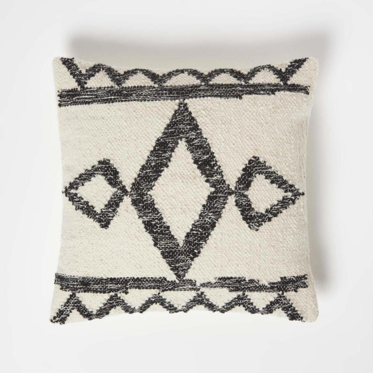 An exclusive collection of colourful and neutral, traditionally handwoven kilim cushions from Homescapes. These durable, hardwearing cushions are woven from a luxury cotton and pure wool blend that creates a tapestry-style cushion, perfect for everyday use. Featuring a traditional textured design that echoes Indian, goemetric and tribal patterns, these colourful cushions are sure to make a statement in any home. Filled with a super soft hypoallergenic super microfibre cushion insert, these heavy-weight cushions are both practical and comfy and will not flatten over time. A range exclusively designed by Homescapes, each cushion cover is expertly handwoven on traditional handlooms, resulting in a truly unique cover each and every time. Using the finest quality fair-trade cotton and wool, each colour has been dyed using natural dyes and finished to the highest standards. Insert Included. Spot Clean only. Complementary kilim rugs, pouffes and home accessories are also available from Homescapes, sold separately. All images are representative of the kilim pattern and colours, however, due to the handcrafted nature of kilim, each cushion design may differ slightly.