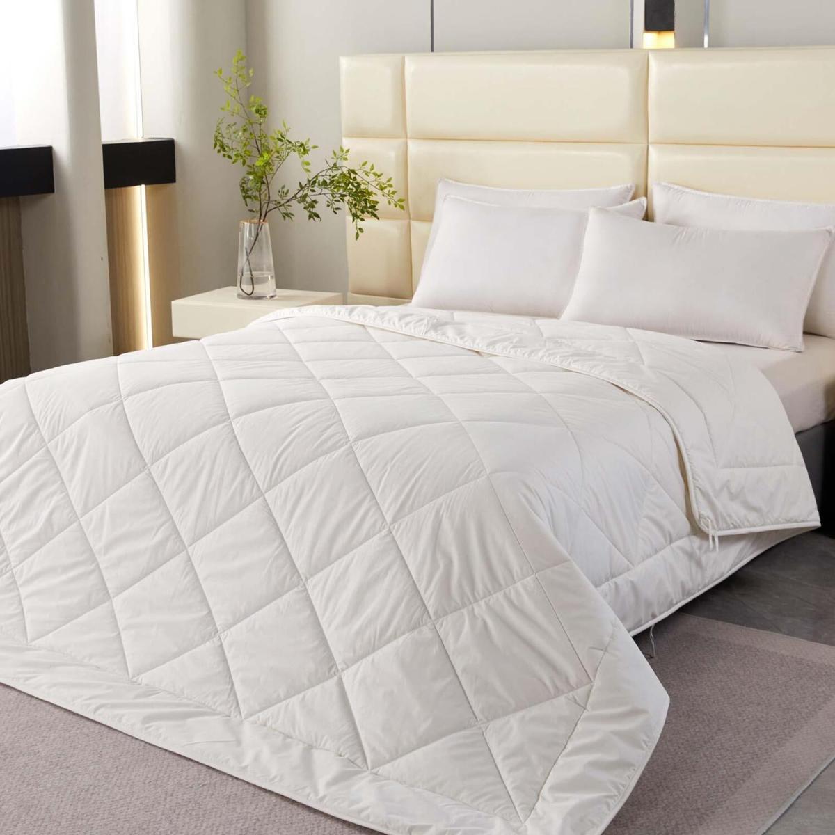 Homescapes presents the ultimate lightweight Australian wool duvet, meticulously designed for the spring and summer seasons. This duvet, filled with 200gsm of premium Australian wool, ensures a comfortable sleep in warmer seasons. Its natural wool is Woolmark certified, assuring top-grade quality. The 100 cotton cover, with a soft 233 thread count, complements the wool's temperature-regulating properties. Ideal for those with menopause-related night sweats, this duvet wicks away moisture, ensuring a dry and comfortable sleep. Our lightweight duvet is not just functional but also elegant, featuring a classic diamond pattern quilting for even distribution of wool. Available in all UK standard sizes, it's versatile for any bed. Homescapes' duvet is conveniently washable at home, maintaining its quality and comfort over time. Choose this duvet for a blend of luxury, health, and environmental consciousness. An exclusive collection of premium wool bedding that will transform your sleep. Crafted from pure Australian wool and 233 thread count super soft cotton, the range includes pillows, duvets and mattress toppers in a range of sizes.