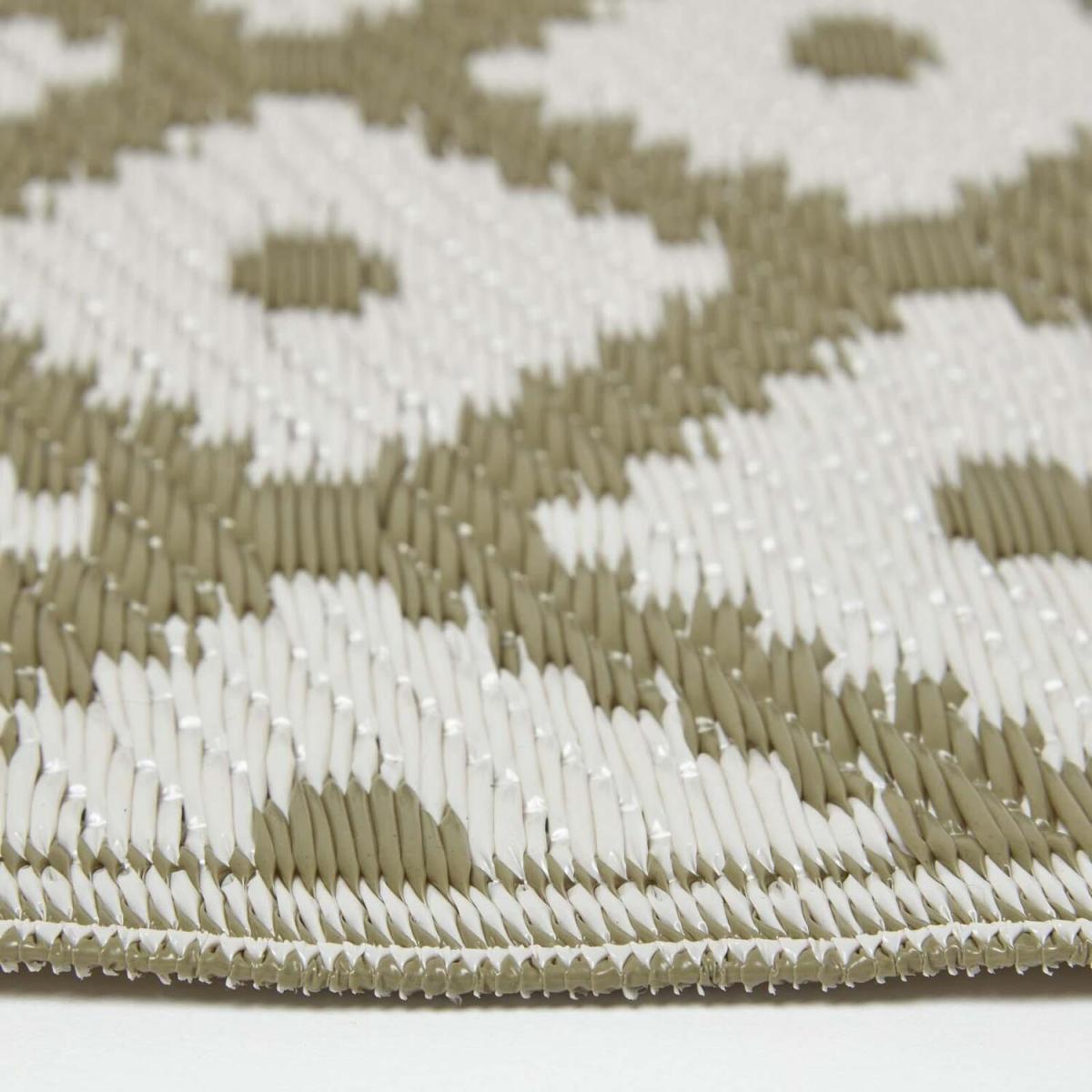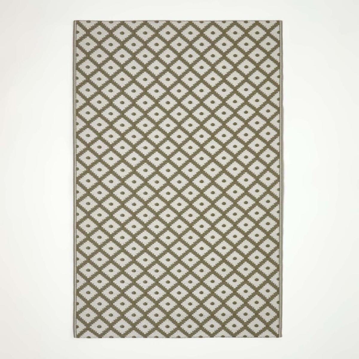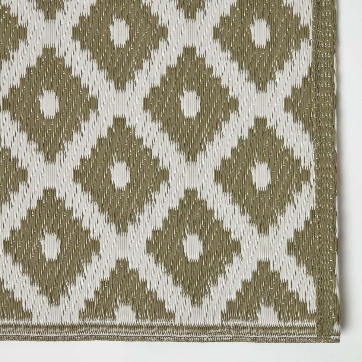 Add some style to your garden or patio area with this classic garden rug from Homescapes. Featuring a striking white and olive green geometric design, this decorative outdoor rug has a distinctive and eye-catching pattern, and has been woven from 100 recycled polypropylene. A recycled rug woven from waste plastics, this large outdoor rug is lightweight and waterproof making it ideal for all weathers and spaces. Ideal for decorating patio, decking and slabbed areas, outdoor rugs are also perfect for picnicking, camping or even on the beach. Simple and easy to clean, simply sweep away dirt or gently wash with mild soapy water. Part of an exclusive range of garden rugs available in several striking designs. From Homescapes range of garden ornaments and accessories, this green outdoor rug will brighten up your garden living areas. Available in 4 sizes, it is the perfect gift for any new homeowner or keen gardener. When you first open your rug, we recommend laying it front side down for a few hours for it to sit flat. Turn your rug regularly to ensure even wear and reduce pressure marks from furniture. If using indoors, you may wish to use an anti-slip mat underneath to prevent the rug from slipping out of place.