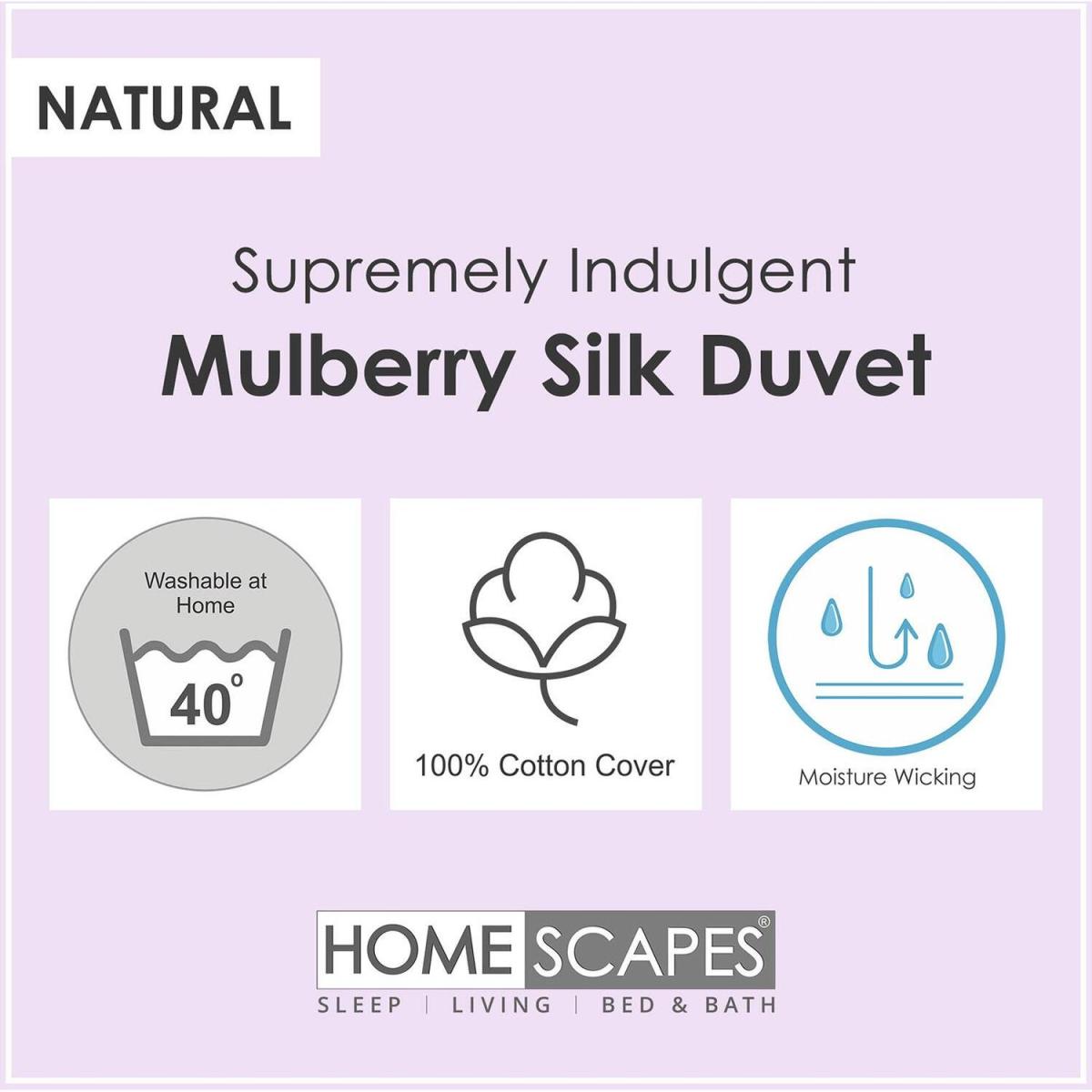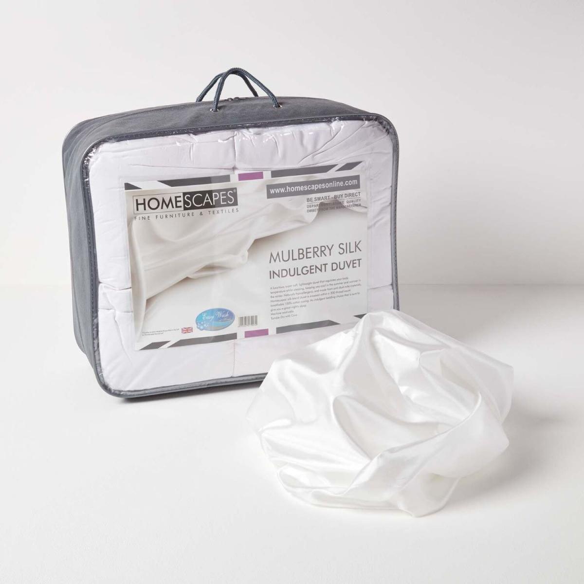 For ultimate luxury, this Homescapes 100 Mulberry Silk polyester blend duvet has a 4.5 Tog rating for summer sleeping. Filled with pure 100 Mulberry silk that naturally regulates body temperature to keep you nice and cool during warmer weather. Widely regarded as the highest quality, Mulberry Silk gains its name because the silk worms that produce the material are fed Mulberry leaves exclusively. This silk contains sercine which makes the duvet incredibly hypoallergenic, so this is the perfect duvet for anyone including those who suffer with allergies. Encased with 100 cotton for breathability, this fabric cover has a 200 thread count, for ultimate comfort and luxury. Similar to wool duvets, silk has natural moisture wicking qualities to ensure a comfortable sleep right through the night.