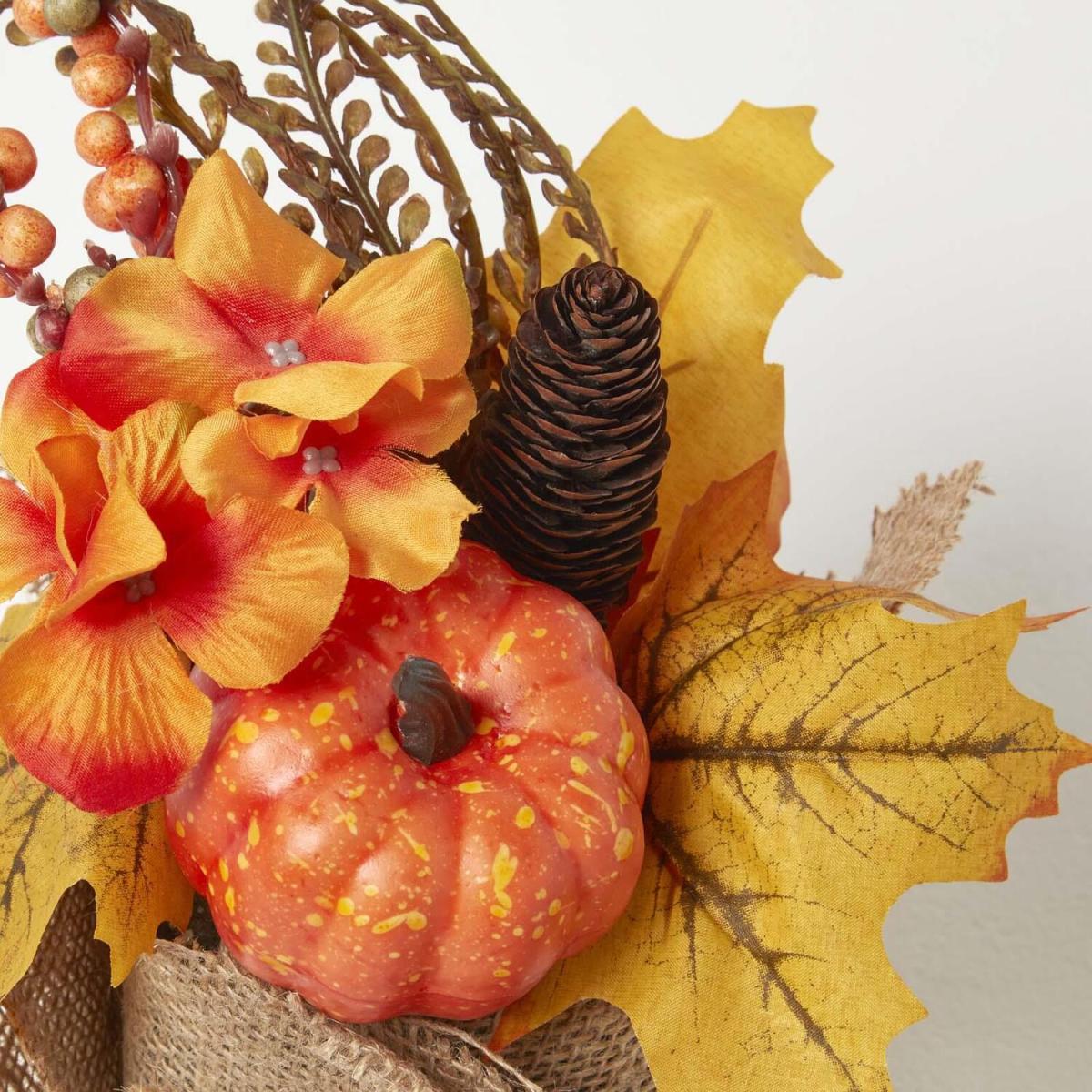 Vibrant orange autumn decorations for the home. This colourful collection of floral autumn dcor features lifelike maple leaves in deep orange, green and yellow and mini pumpkins and squashes. The range includes colourful door wreaths, decorative garlands and table top autumn dcor. Suitable for indoor decoration, the autumn garland measures 1.4 m in length and has a handy loop tie each end so it can be easily affixed when hanging. Adding a burst of colour to your front door, the autumn door wreath measures 40 cm wide and features a range of lifelike orange and green pumpkins. The range is completed with decorative autumnal display of pumpkins, yellow maple leaves and wheatsheaf in a rustic style burlap pot.