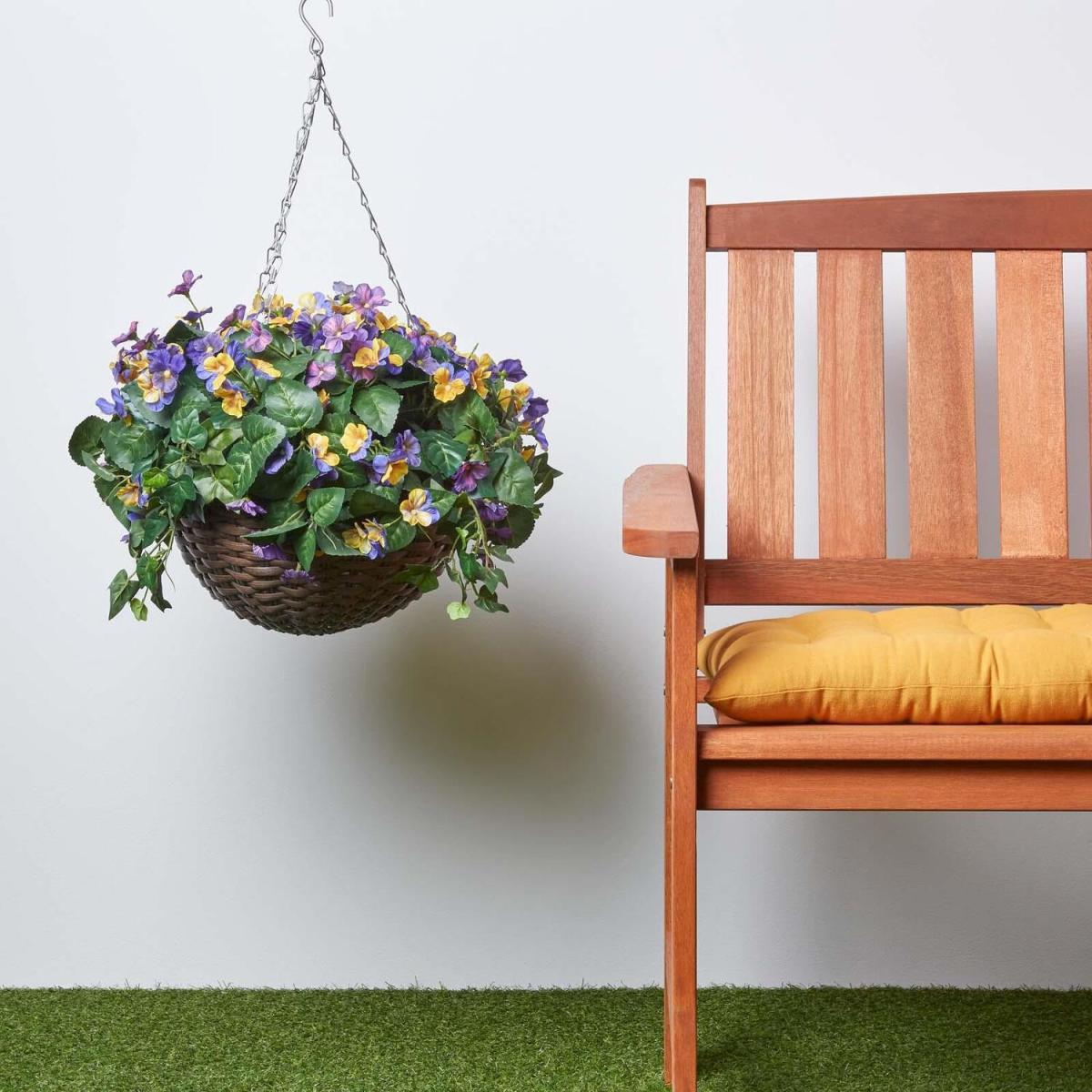 Bright and colourful artificial pansy hanging basket, featuring a mix of yellow and purple flowers. Set inside a stylish brown hanging basket with a silver metal chain to make displaying quick and easy. To give a nice, floral touch to your home, you can hang in your conservatory, beside your front door or outdoors in shaded or sheltered areas. Measuring 60 cm in length with a pot diameter of 30 cm, this medium faux hanging basket is much easier to maintain than real hanging baskets, which can take months to grow. To prevent colours from fading, this artificial pansy plant has been treated with UV protection. As with all of Homescapes realistic artificial flowers and plants, this fake hanging basket has been handcrafted by skilled experts to ensure that it looks just as good as the real thing with no details spared. There are more artificial hanging baskets to choose from at Homescapes. Easy to maintain, simply keep out of direct sunlight and wipe away dust with a soft cloth.