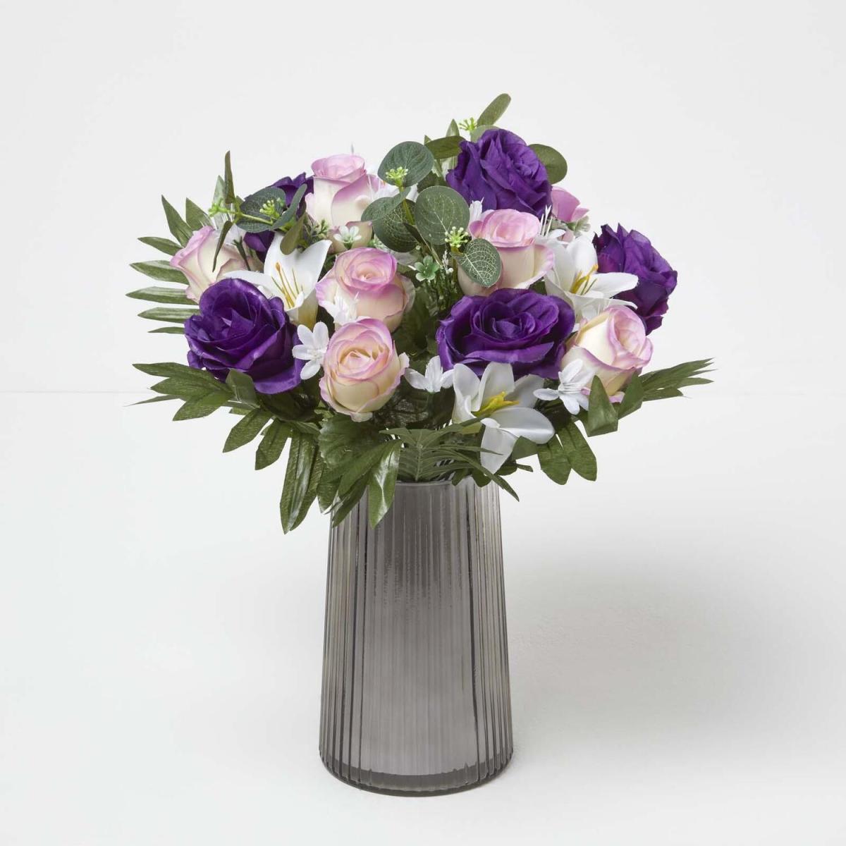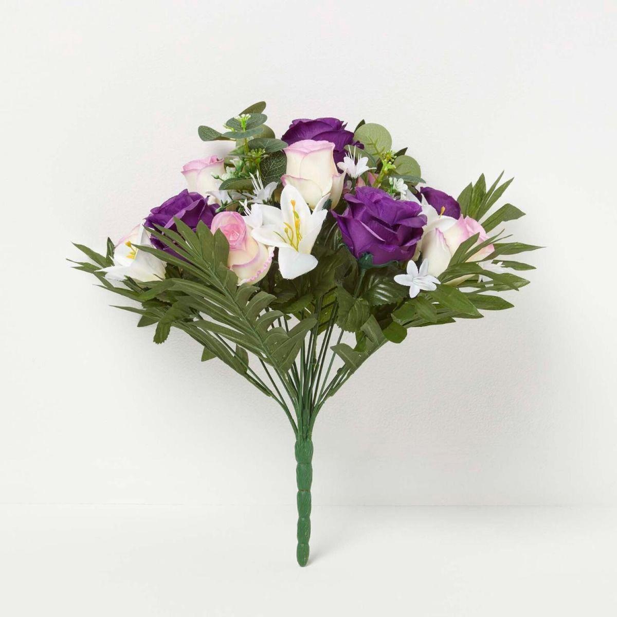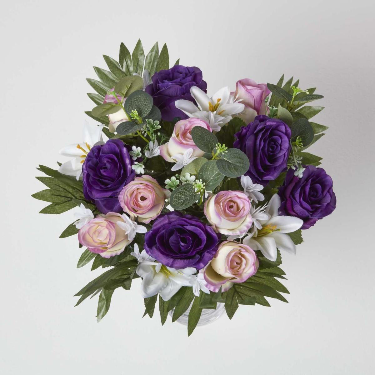 Dark purple roses and white lilies surrounded by lush green leaves and foliage. Measuring 35 cm tall and 30 cm wide, these decorative flowers are joined together in a sturdy plastic stem, ideal for holding or placing in decorative vases. Decorative artificial flower bouquets handcrafted from silk-like polyester these real touch petals and leaves are just like the real thing. Requiring little maintenance, artificial bouquets are forever in bloom and will remain bright and colourful all year through. Ideal for indoor decoration around the home or used during weddings and events, they are perfect for adding a splash of natural colour.