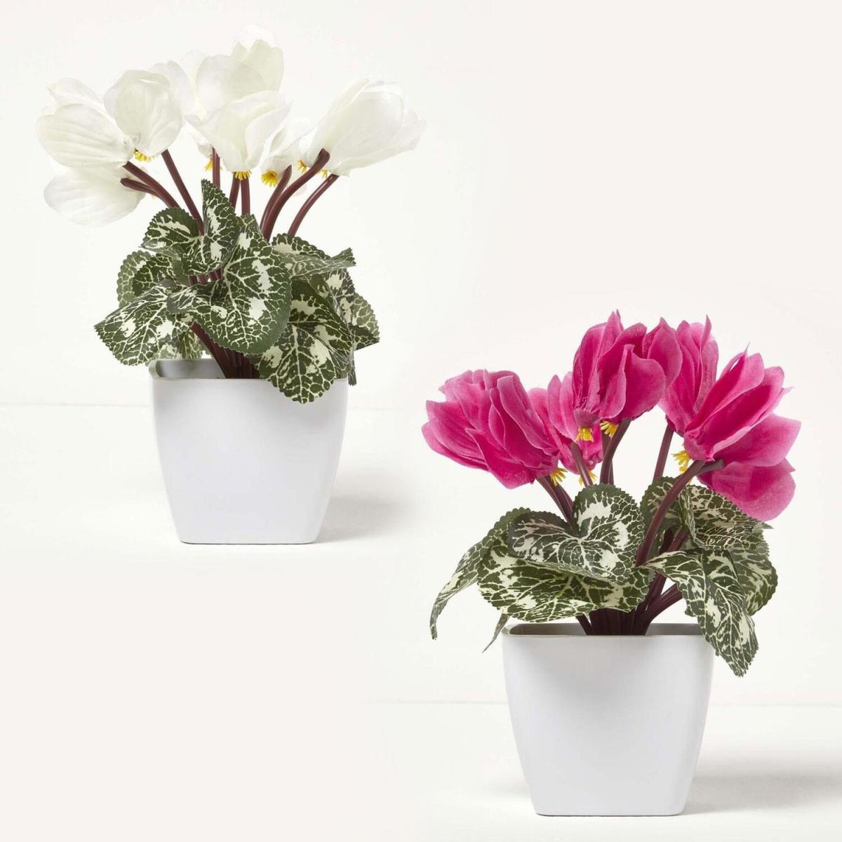 Set of 2 artificial potted Cyclamen plants potted in a modern white pot. Each striking faux Cyclamen flower features up to 8 dark stems surrounded by veriagated leaves and foliage. A burst of colour perfect for indoor home or office decoration, each petal is hand cut from a silk-like material, ensuring true botanical accuracy and attention to detail. Each plant has been UV treated to ensure lasting colour, making it ideal for decorating a kitchen windowsill, side table or office desk. This no maintenance faux artificial plant is part of Homescapes huge collection of exclusively designed fake plants and trees, and can be purchased in pink or cream.