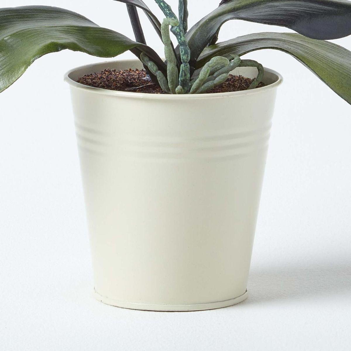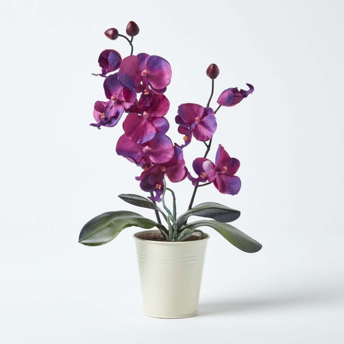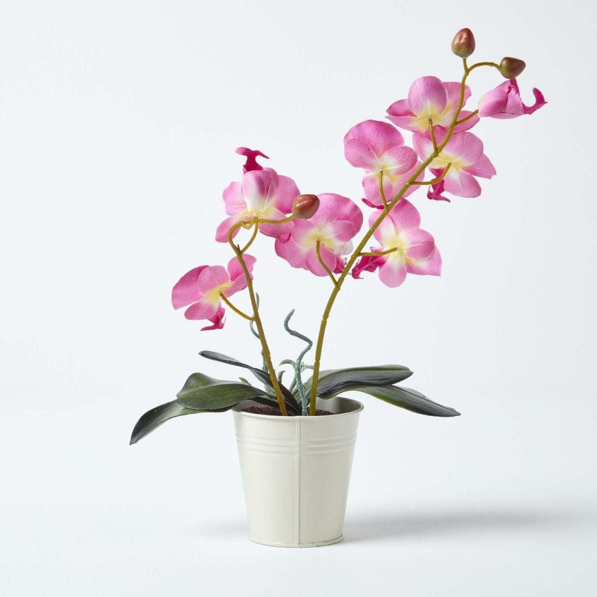 Stylish pink artificial orchid from Homescapes, set inside an off-white tin pot. Measuring approximately 38 cm tall, this faux orchid will give your interiors a floral look with rustic charm. The decorative off-white tin pot is completely unique and this orchid looks great displayed in your kitchen, bathroom or conservatory. As with all of Homescapes artificial flowers, plants and orchids, it has been carefully crafted by hand to replicate the phalaenopsis orchid, ensuring that it looks realistic and lifelike. With no need for constant maintenance or watering, simply wipe away dust with a soft cloth. Also available in a dark purple colour so you can mix and match if you wish.