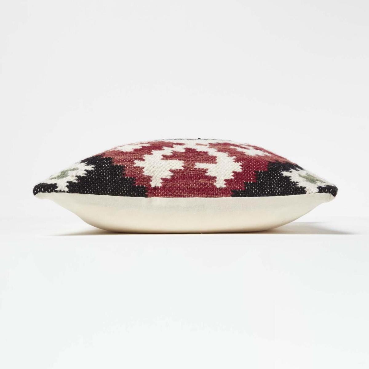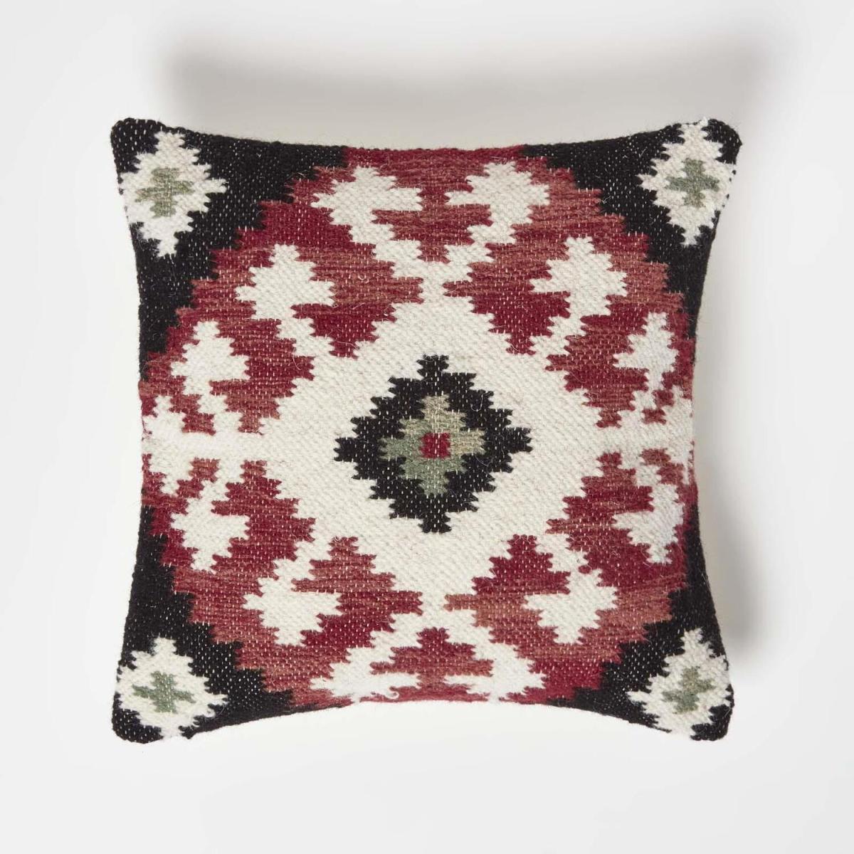An exclusive collection of colourful and neutral, traditionally handwoven kilim cushions from Homescapes. These durable, hardwearing cushions are woven from a luxury cotton and pure wool blend that creates a tapestry-style cushion, perfect for everyday use. Featuring a traditional textured design that echoes Indian, goemetric and tribal patterns, these colourful cushions are sure to make a statement in any home. Filled with a super soft hypoallergenic super microfibre cushion insert, these heavy-weight cushions are both practical and comfy and will not flatten over time. A range exclusively designed by Homescapes, each cushion cover is expertly handwoven on traditional handlooms, resulting in a truly unique cover each and every time. Using the finest quality fair-trade cotton and wool, each colour has been dyed using natural dyes and finished to the highest standards. Insert Included. Spot Clean only. Complementary kilim rugs, pouffes and home accessories are also available from Homescapes, sold separately. All images are representative of the kilim pattern and colours, however, due to the handcrafted nature of kilim, each cushion design may differ slightly.