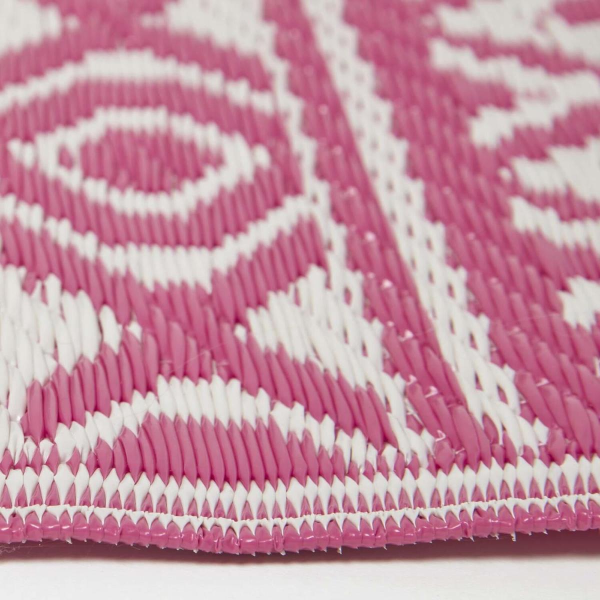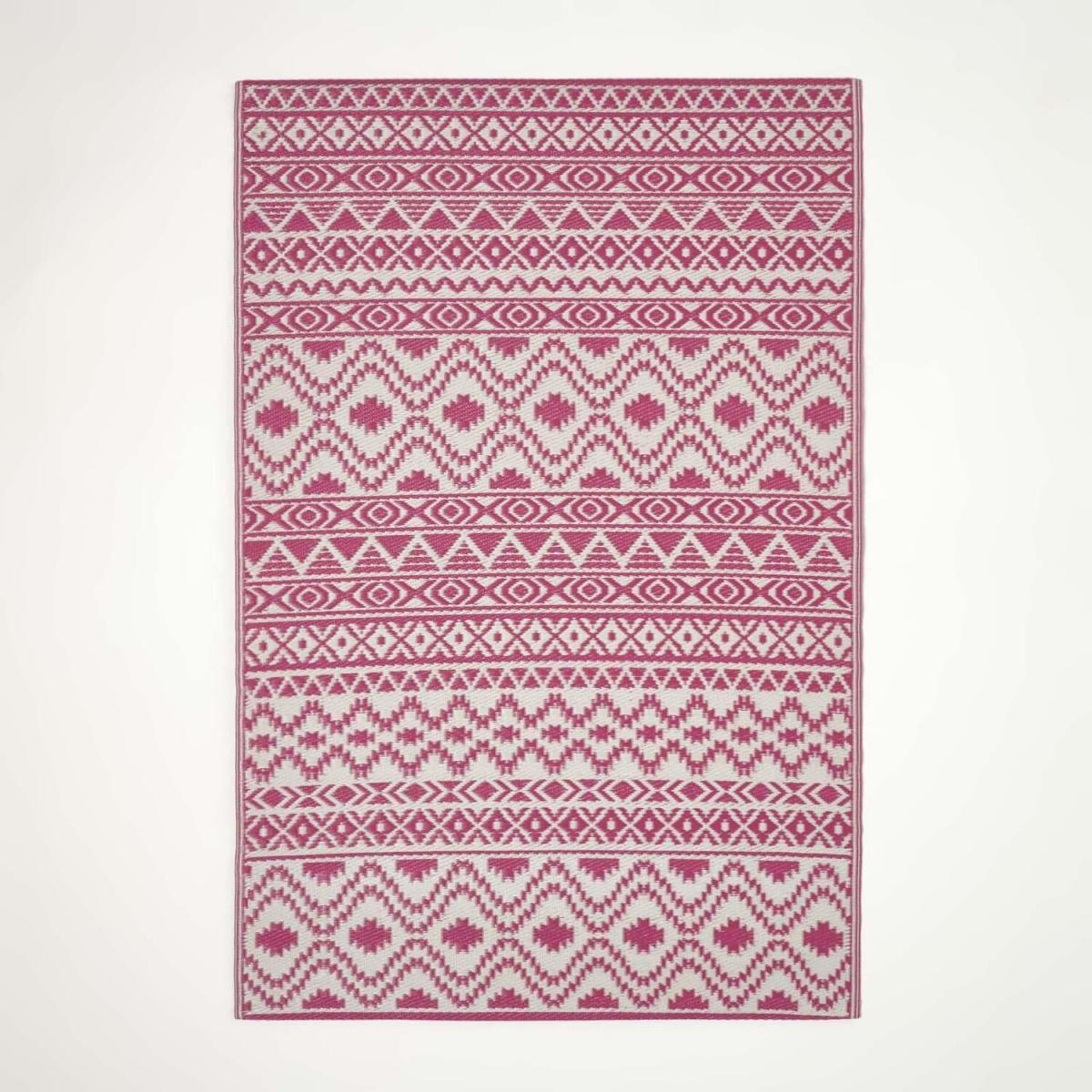 Add some style to your garden or patio area with this wild garden rug from Homescapes. Featuring a striking pink and white aztec design, this decorative outdoor rug has a distinctive and eye-catching pattern, and has been woven from 100 recycled polypropylene. A recycled rug woven from waste plastics, this large outdoor rug is lightweight and waterproof making it ideal for all weathers and spaces. Ideal for decorating patio, decking and slabbed areas, outdoor rugs are also perfect for picnicking, camping or even on the beach. Simple and easy to clean, simply sweep away dirt or gently wash with mild soapy water. Part of an exclusive range of garden rugs available in several striking designs. From Homescapes range of garden ornaments and accessories, this pink outdoor rug will brighten up your garden living areas. Available in 3 sizes, it is the perfect gift for any new homeowner or keen gardener. When you first open your rug, we recommend laying it front side down for a few hours for it to sit flat. Turn your rug regularly to ensure even wear and reduce pressure marks from furniture. If using indoors, you may wish to use an anti-slip mat underneath to prevent the rug from slipping out of place.