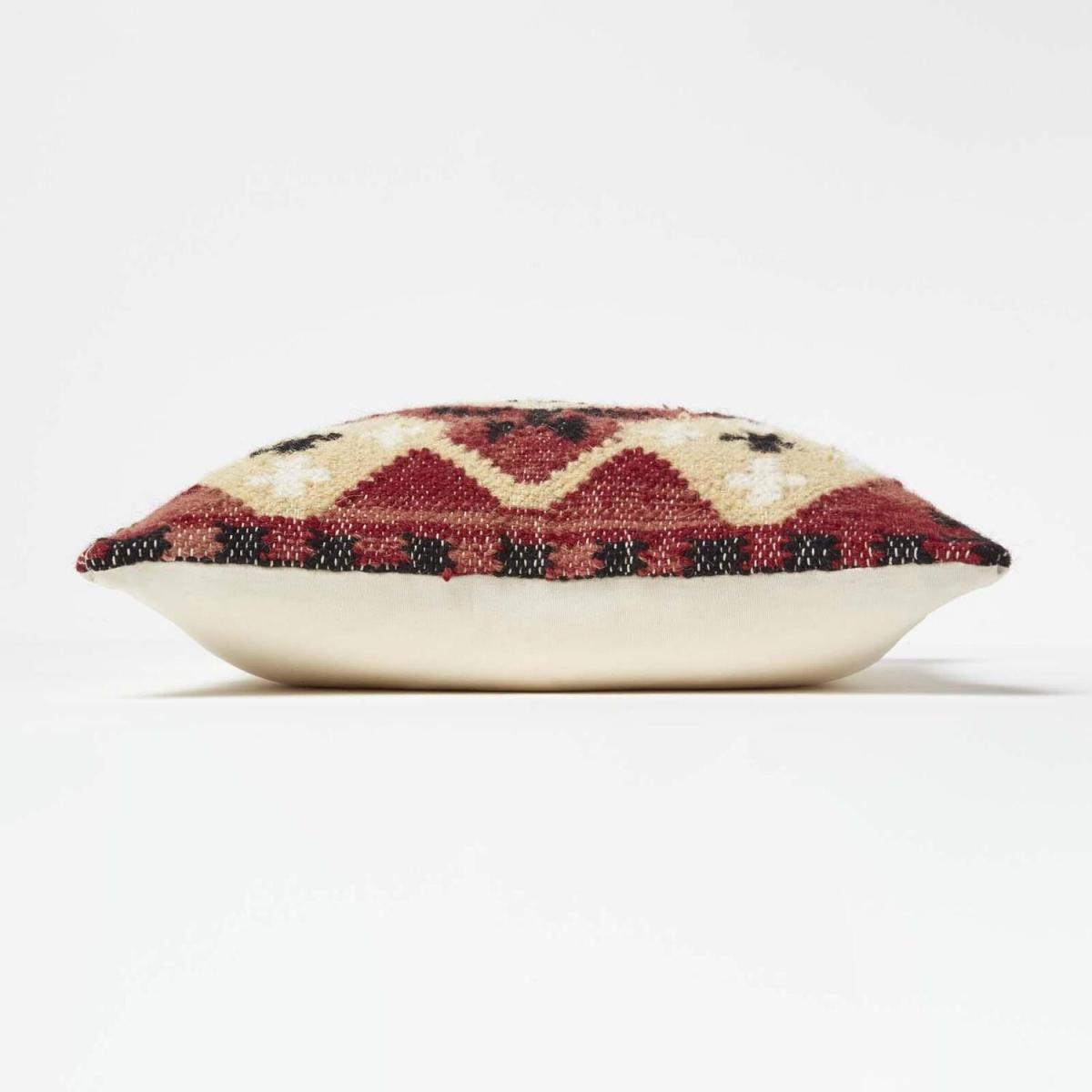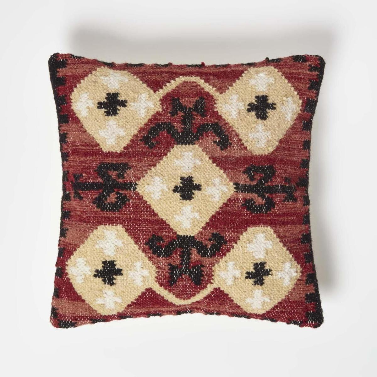 An exclusive collection of colourful and neutral, traditionally handwoven kilim cushions from Homescapes. These durable, hardwearing cushions are woven from a luxury cotton and pure wool blend that creates a tapestry-style cushion, perfect for everyday use. Featuring a traditional textured design that echoes Indian, goemetric and tribal patterns, these colourful cushions are sure to make a statement in any home. Filled with a super soft hypoallergenic super microfibre cushion insert, these heavy-weight cushions are both practical and comfy and will not flatten over time. A range exclusively designed by Homescapes, each cushion cover is expertly handwoven on traditional handlooms, resulting in a truly unique cover each and every time. Using the finest quality fair-trade cotton and wool, each colour has been dyed using natural dyes and finished to the highest standards. Insert Included. Spot Clean only. Complementary kilim rugs, pouffes and home accessories are also available from Homescapes, sold separately. All images are representative of the kilim pattern and colours, however, due to the handcrafted nature of kilim, each cushion design may differ slightly.
