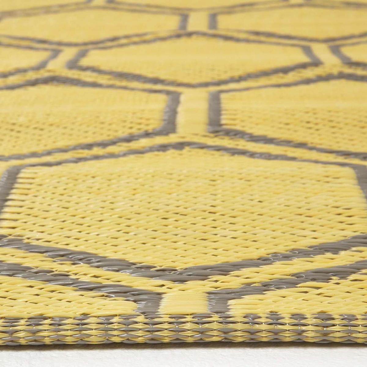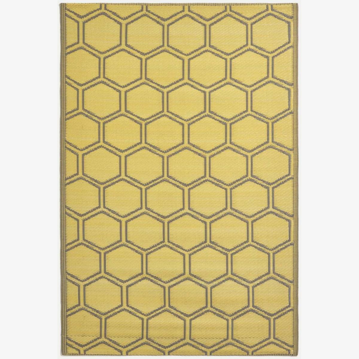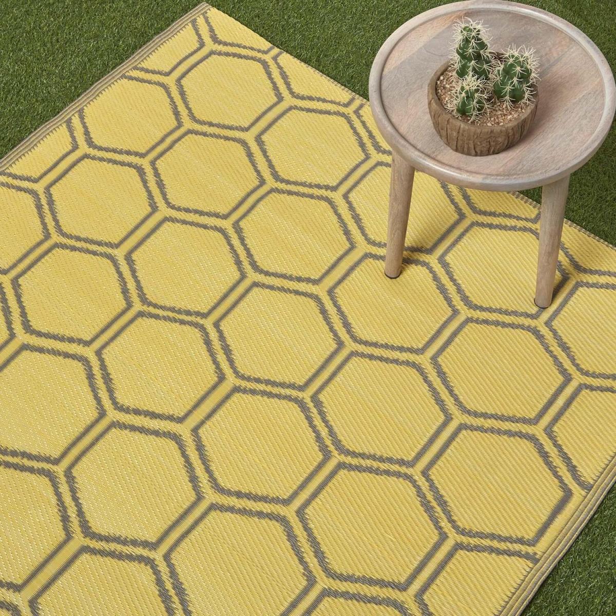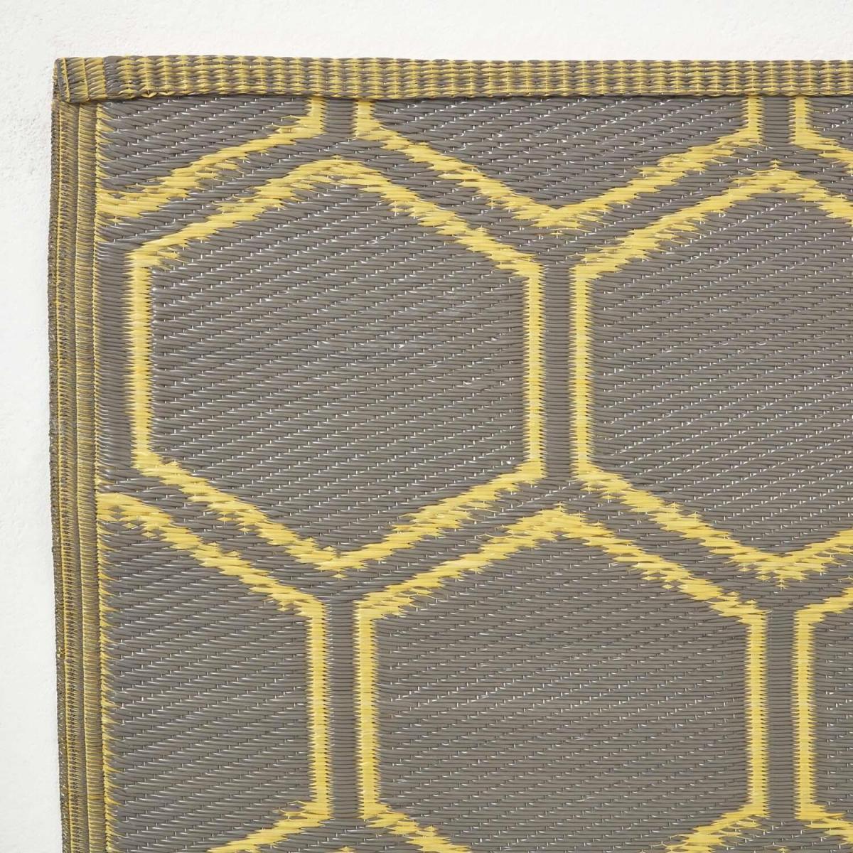 Add some style to your garden or patio area with this wild garden rug from Homescapes. Featuring a striking yellow honeycomb design, this decorative outdoor rug has a distinctive and eye-catching pattern, and has been woven from 100 recycled polypropylene. A recycled rug woven from waste plastics, this large outdoor rug is lightweight and waterproof making it ideal for all weathers and spaces. Ideal for decorating patio, decking and slabbed areas, outdoor rugs are also perfect for picnicking, camping or even on the beach. Simple and easy to clean, simply sweep away dirt or gently wash with mild soapy water. Part of an exclusive range of garden rugs available in several striking designs. From Homescapes range of garden ornaments and accessories, this yellow outdoor rug will brighten up your garden living areas. Available in one size, it is the perfect gift for any new homeowner or keen gardener. When you first open your rug, we recommend laying it front side down for a few hours for it to sit flat. Turn your rug regularly to ensure even wear and reduce pressure marks from furniture. If using indoors, you may wish to use an anti-slip mat underneath to prevent the rug from slipping out of place.