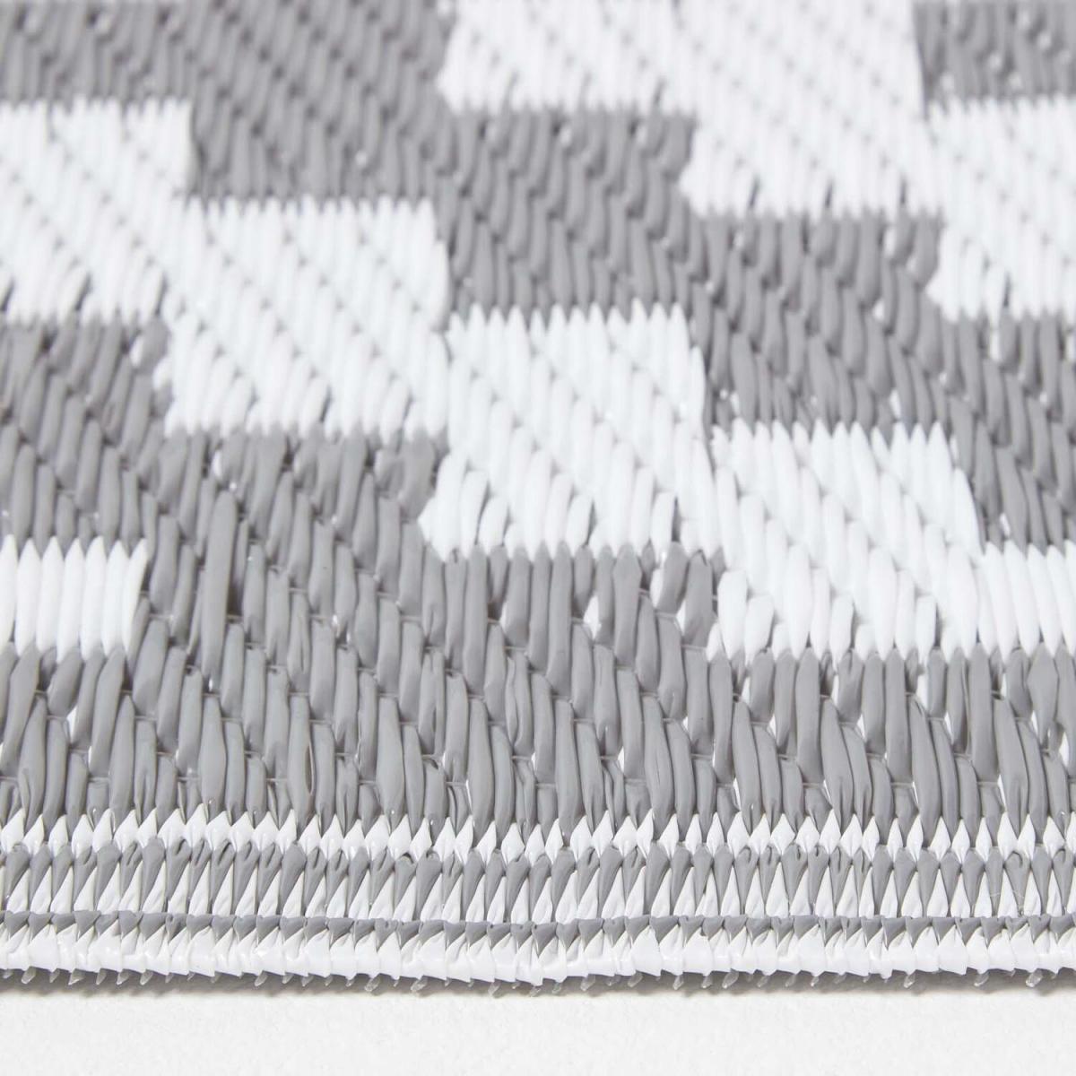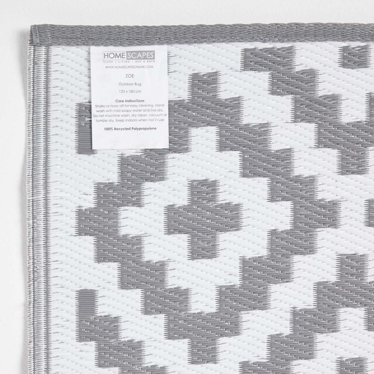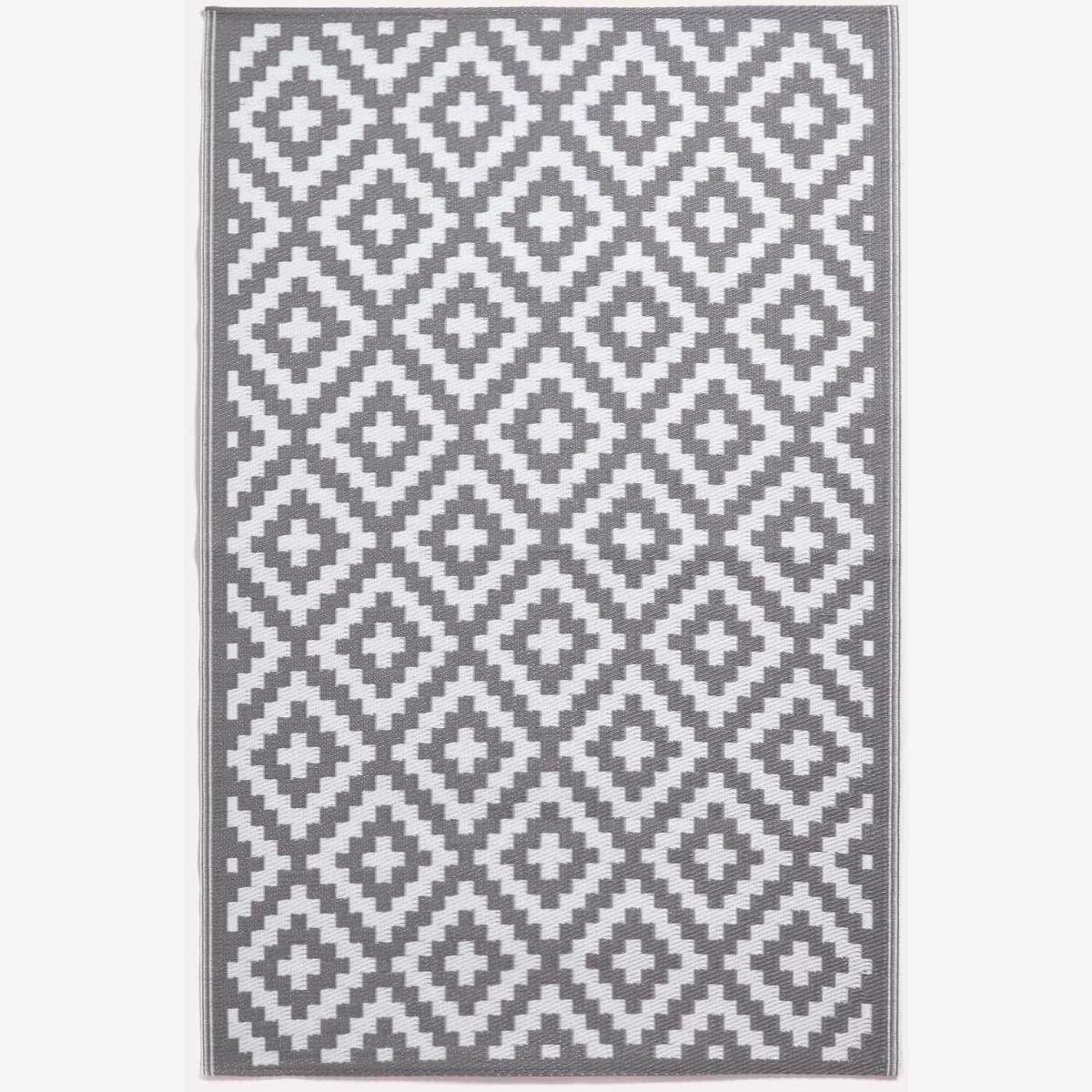 Add some style to your garden or patio area with this large garden rug from Homescapes. In grey and white, this decorative outdoor rug has a distinctive geometric pattern and has been woven from 100% recycled polypropylene. An eco-friendly rug made from waste plastics, this large outdoor rug is lightweight and waterproof, making it ideal for all weathers and spaces. Ideal for decorating patio, decking and slabbed areas, outdoor rugs are also perfect for picnicking, camping or even on the beach. Simple and easy to clean, simply sweep away dirt or gently wash with mild soapy water. Part of an exclusive range of garden rugs available in several striking designs. From Homescapes range of garden ornaments and accessories, this grey outdoor rug will brighten up your garden living areas. Available in 2 sizes, it is the perfect gift for any new homeowner or keen gardener. When you first open your rug, we recommend laying it front side down for a few hours for it to sit flat. Turn your rug regularly to ensure even wear and reduce pressure marks from furniture. If using indoors, you may wish to use an anti-slip mat underneath to prevent the rug from slipping out of place.