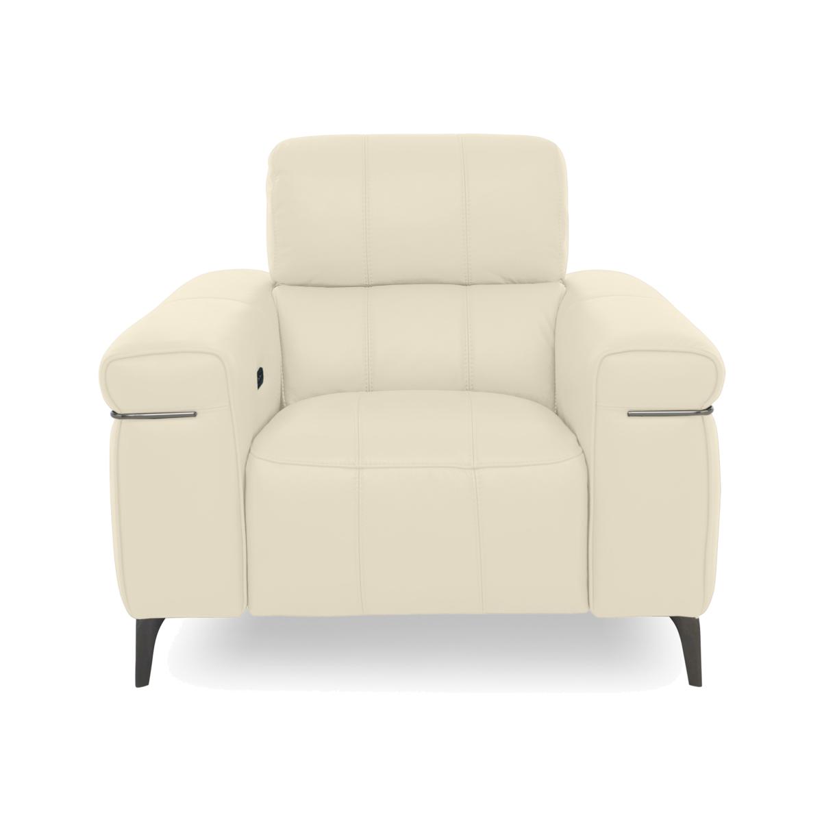 Turn your living room into the most stylish of in-home cinemas with sofas, chairs and footstools from our Homestage range. The collection includes stunning media sofas and armchairs that connect via Bluetooth to your TV or phone and have surround sound speakers hidden in the incredibly comfortable cushioning for the next level in 4. D entertainment. And with power recliners with independently-moving backrests and footrests, perfect-position power headrests, built-in massage units and sprung seats and backs, the comfort is every bit as enthralling. Made in Italy and available in a wide choice of soft fabric and 100% leather upholstery options, the Homestage range is a Furniture Village exclusive. Cool Italian style meets power comfort in this superb armchair that’s handmade in Italy exclusively for Furniture Village. Why you’ll love it Contemporary Italian design ensures you’ll be relaxing in style. Power recliner with independent backrest and footrest motion. Perfect-position headrest means perfect comfort, every time. Sprung seat and back for superbly balanced support. 100% leather upholstery with linear stitching in a huge choice of on-trend colours. Stiletto-style metal legs with a high-shine nickel-plated finish in black. Matching metal arm trim. Handmade in Italy. A Furniture Village exclusive. This leather power recliner chair is part of our Homestage range. What you need to know Medium comfort level. Seat suspension: no-sag springs. Seat cushioning: foam and inner coil spring. Cushioning is fixed. Back suspension: rubber webbing. Back cushioning: foam and loose fibre. Cushioning is fixed. Arm cushioning: foam and fibre. Please allow time for new recliners to ease. Minor gaps are necessary to ensure ease of recliner motion and may be exaggerated depending on floor type. Leather has unique marks and characteristics with variation in colour and texture. Leather softens with use. Smoothing the tops of leather cushions prevents signs of visual comfort. Please read our upholstery care guide for more advice.