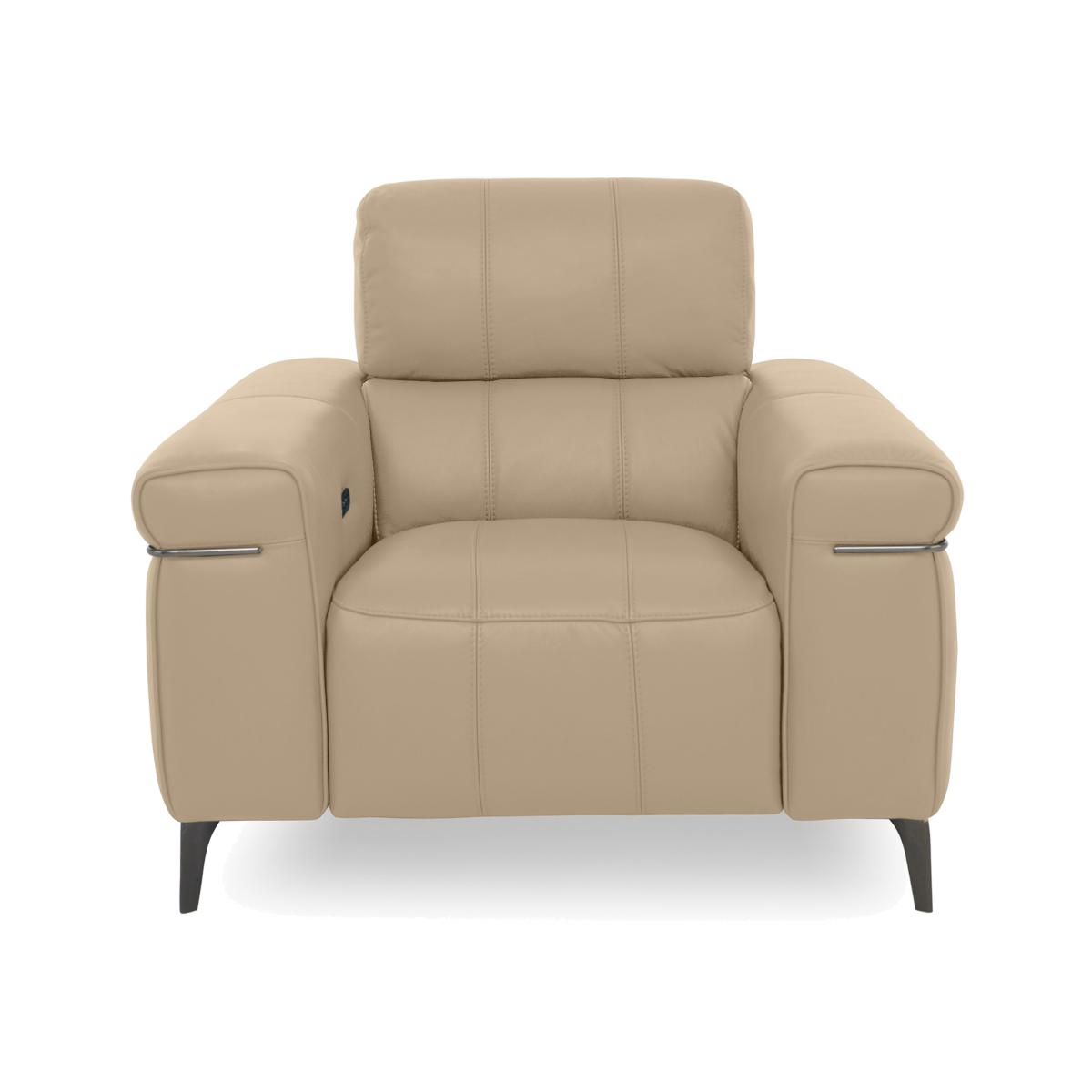 Turn your living room into the most stylish of in-home cinemas with sofas, chairs and footstools from our Homestage range. The collection includes stunning media sofas and armchairs that connect via Bluetooth to your TV or phone and have surround sound speakers hidden in the incredibly comfortable cushioning for the next level in 4. D entertainment. And with power recliners with independently-moving backrests and footrests, perfect-position power headrests, built-in massage units and sprung seats and backs, the comfort is every bit as enthralling. Made in Italy and available in a wide choice of soft fabric and 100% leather upholstery options, the Homestage range is a Furniture Village exclusive. Cool Italian style meets power comfort in this superb armchair that’s handmade in Italy exclusively for Furniture Village. Why you’ll love it Contemporary Italian design ensures you’ll be relaxing in style. Power recliner with independent backrest and footrest motion. Perfect-position headrest means perfect comfort, every time. Sprung seat and back for superbly balanced support. 100% leather upholstery with linear stitching in a huge choice of on-trend colours. Stiletto-style metal legs with a high-shine nickel-plated finish in black. Matching metal arm trim. Handmade in Italy. A Furniture Village exclusive. This leather power recliner chair is part of our Homestage range. What you need to know Medium comfort level. Seat suspension: no-sag springs. Seat cushioning: foam and inner coil spring. Cushioning is fixed. Back suspension: rubber webbing. Back cushioning: foam and loose fibre. Cushioning is fixed. Arm cushioning: foam and fibre. Please allow time for new recliners to ease. Minor gaps are necessary to ensure ease of recliner motion and may be exaggerated depending on floor type. Leather has unique marks and characteristics with variation in colour and texture. Leather softens with use. Smoothing the tops of leather cushions prevents signs of visual comfort. Please read our upholstery care guide for more advice.