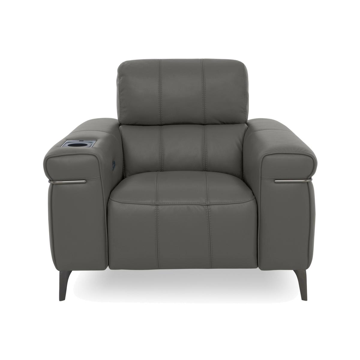 Turn your living room into the most stylish of in-home cinemas with sofas, chairs and footstools from our Homestage range. The collection includes stunning media sofas and armchairs that connect via Bluetooth to your TV or phone and have surround sound speakers hidden in the incredibly comfortable cushioning for the next level in 4. D entertainment. And with power recliners with independently-moving backrests and footrests, perfect-position power headrests, built-in massage units and sprung seats and backs, the comfort is every bit as enthralling. Made in Italy and available in a wide choice of soft fabric and 100% leather upholstery options, the Homestage range is a Furniture Village exclusive. This Italian power recliner chair in 100% leather delivers more than style. This media chair comes with Bluetooth and surround sound built in for an at-home cinematic experience like never before. Why you’ll love it Cinema-style entertainment meets contemporary Italian style in this media chair. Bluetooth connection to your TV or phone for an immersive 4. D experience. Surround sound speakers are embedded into cushioning. With wireless, USB and USB-C charging. Power recliner features independent backrest and footrest motion. Perfect-position headrest means perfect comfort, every time. Built-in massage feature for the ultimate in relaxation. Sprung seat and back for superbly balanced support wherever you sit. 100% leather upholstery with linear stitching in a huge choice of on-trend colours. Stiletto-style metal legs with a high-shine nickel-plated finish in black. Matching metal arm trim. Handmade in Italy. A Furniture Village exclusive. This leather power recliner media chair is part of our Homestage range. What you need to know Medium comfort level. Seat suspension: no-sag springs. Seat cushioning: foam and inner coil spring. Cushioning is fixed. Back suspension: rubber webbing. Back cushioning: foam and loose fibre. Cushioning is fixed. Arm cushioning: foam and fibre. Please allow time for new recliners to ease. Minor gaps are necessary to ensure ease of recliner motion and may be exaggerated depending on floor type. Leather has unique marks and characteristics with variation in colour and texture. Leather softens with use. Smoothing the tops of leather cushions prevents signs of visual comfort. Please read our upholstery care guide for more advice.