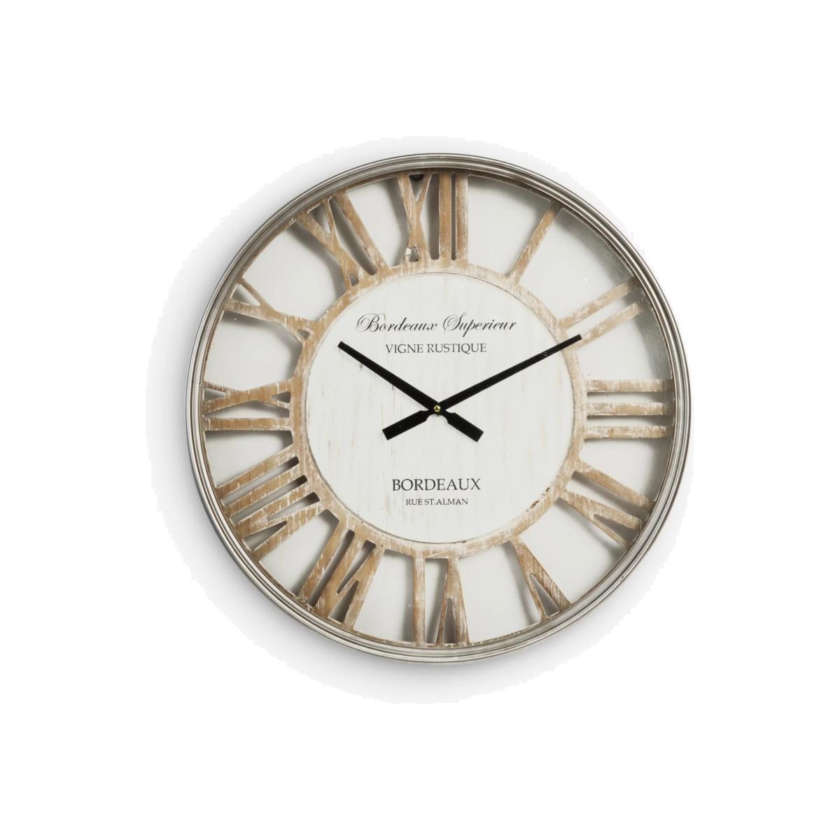 Bringing a vintage feel to a home, this wall clock from HOMEtime features traditional Roman numerals and a limewash shabby chic dial. The cut-out numerals dial are on a wood-effect face with black straight hands and a metal frame.