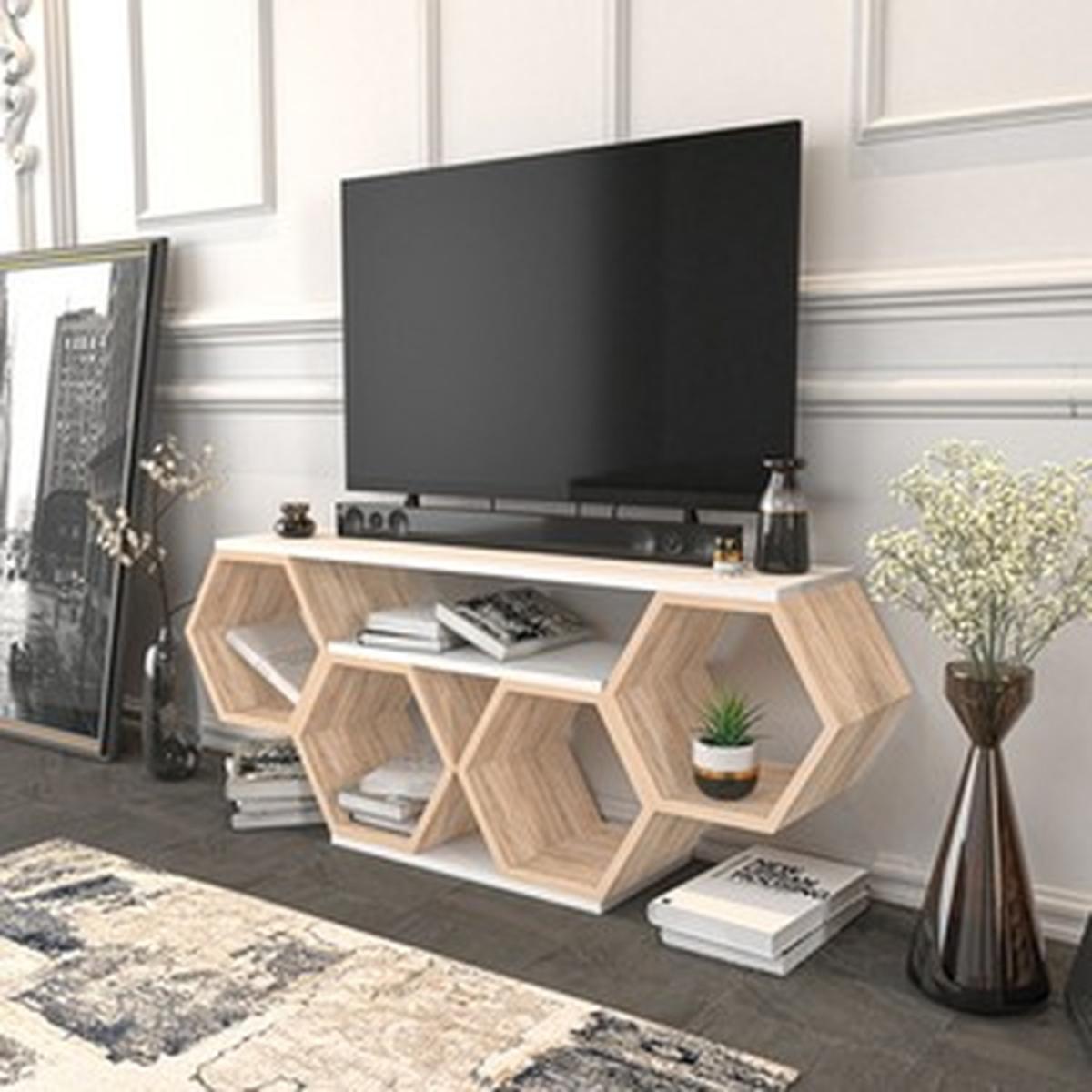 I’m a fan of this honeycomb TV unit because its graphic form brings structure without feeling heavy, and the white and Sonoma oak tones work brilliantly in Scandi-inspired or contemporary schemes. The open hexagon shelves are ideal for stashing baskets or stacking coffee-table books, while the smooth white top gives you space for a slimline soundbar or a pair of matching lamps. To keep it looking sharp, group items in odd numbers and vary heights - a small plant in one cell, a neat stack of records in another, for example. Tuck cables out of sight with simple clips or a slim cable tray underneath, and resist the urge to overfill: that distinctive honeycomb shape is the real star.