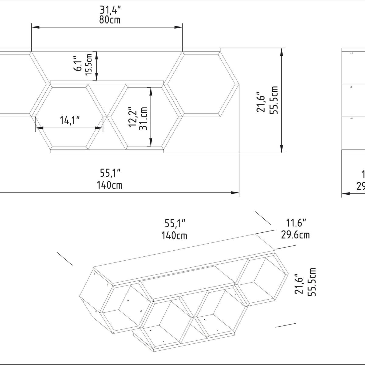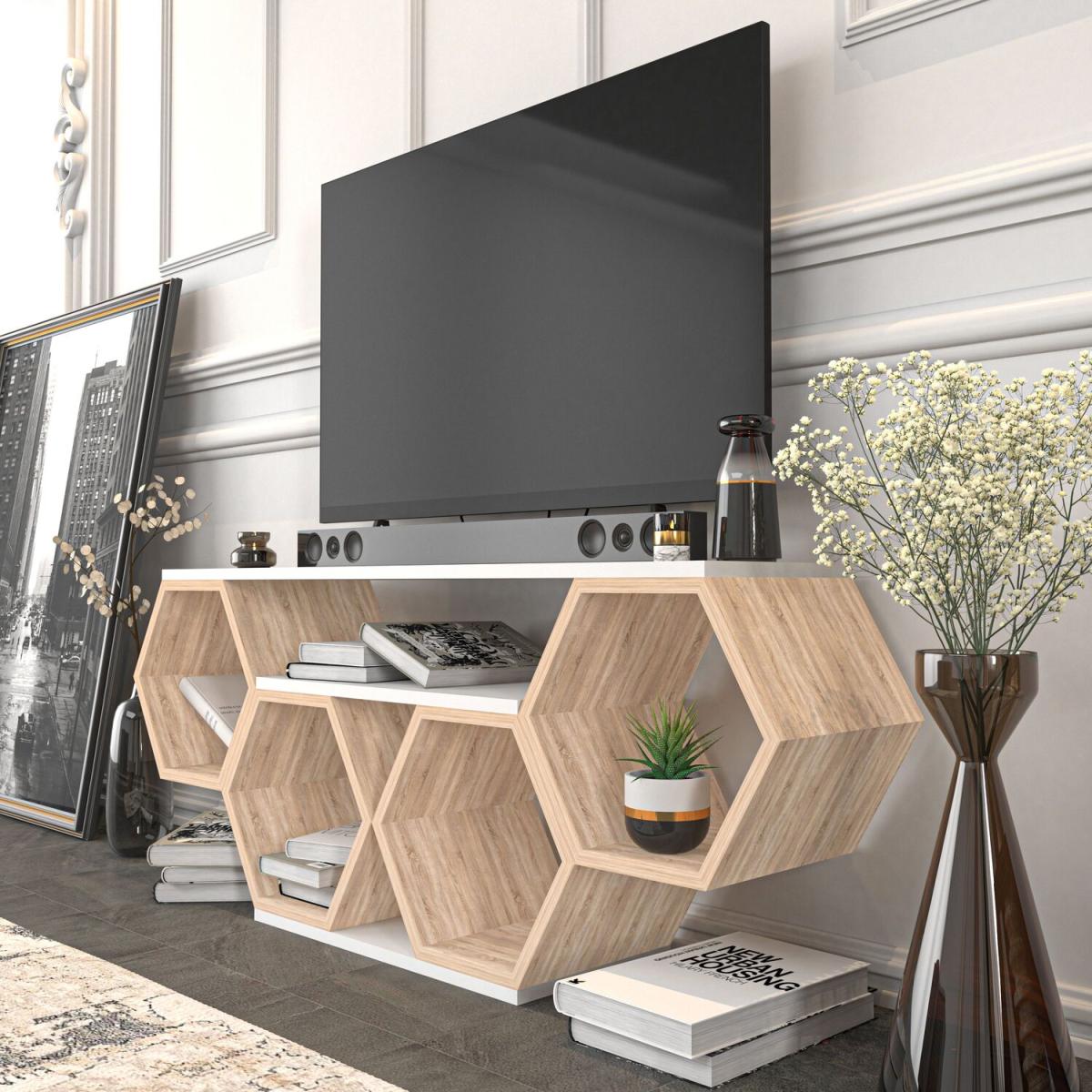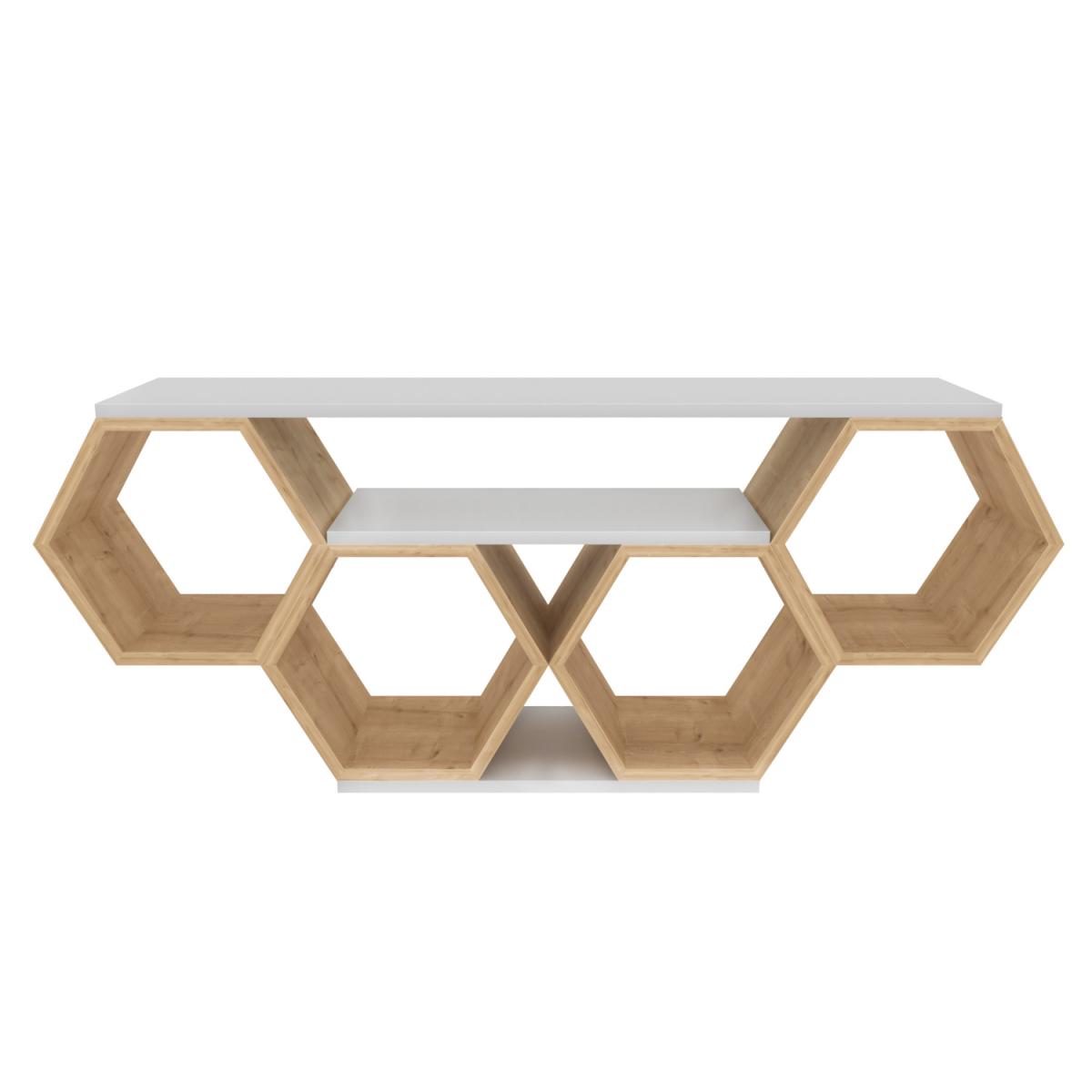 Would you like to make a difference in your living room with this unusual TV unit design? Bring a streamlined style to your living room with this TV stand. The modern TV unit has an elegant open shelving design while being both decorative and functional. The media console features 4 hexagon honeycomb shelves, 2 small triangle shelves, and a horizontal shelf, providing ample storage space for displaying your books, vases, ceramic statuettes, candles, etc.