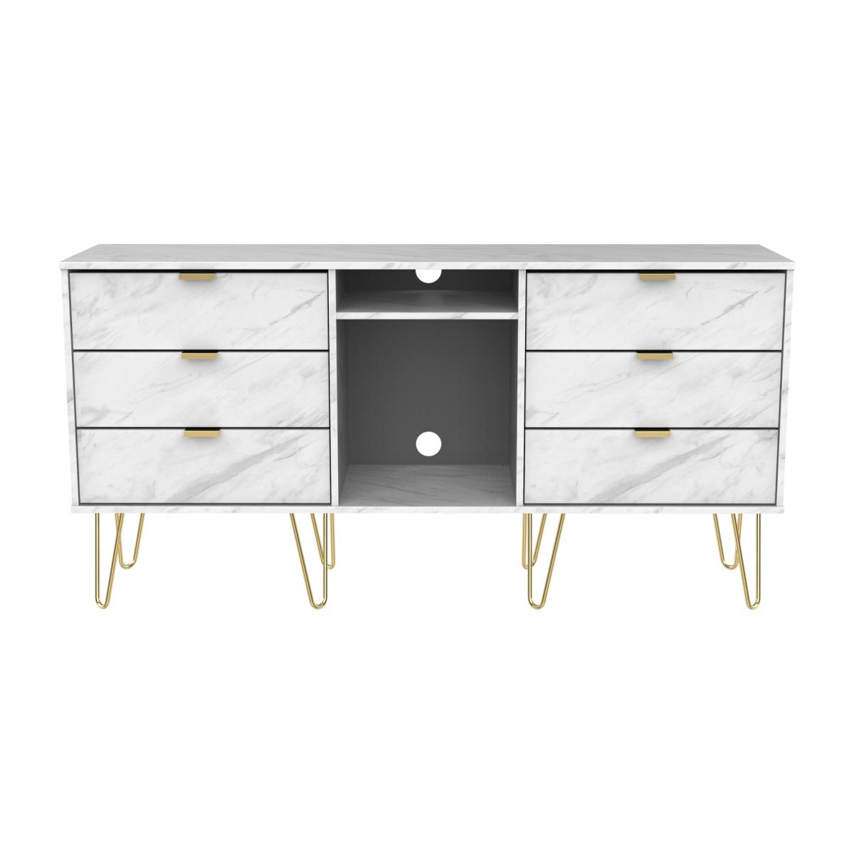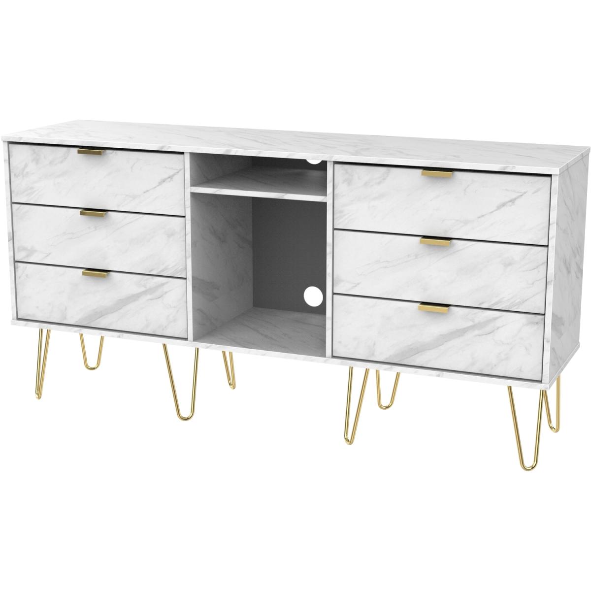 This wide storage unit features 6 storage drawers with a central shelf. Suitable for use as a TVMedia unit or sideboard. The modern, stylish Hong Kong range is available in a range of durable scratch resistant colour or natural wood finishes. With pull handles on all doors and drawers, with black sleigh metal legs. All drawers come with long lasting metal drawer runners and a linen effect interior. All our furniture is made in the United Kingdom, to the highest quality. It is delivered direct to your location of choice by one of our two man delivery teams, and come full assembled (although legs may be removed to prevent damage in transit).