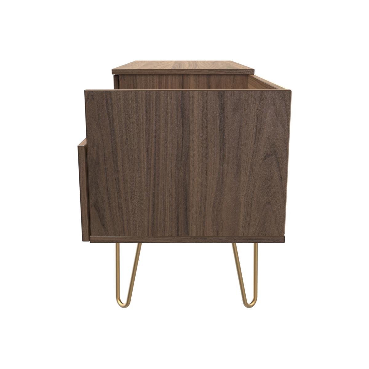 This modern Console unit features a top surface with 2 different levels as well as 2 storage drawers of different depths. Modern and stylish, this striking range is available in a range of durable scratch resistant colour or natural wood finishes. With pull handles on all doors and drawers, with gold hairpin metal legs. Comes with Soft Close Drawers. All our furniture is made to order in the United Kingdom, to the highest quality. It is delivered within 10 working days direct to your location of choice by one of our two man delivery teams, and comes fully assembled (although legs may be removed to prevent damage in transit).
