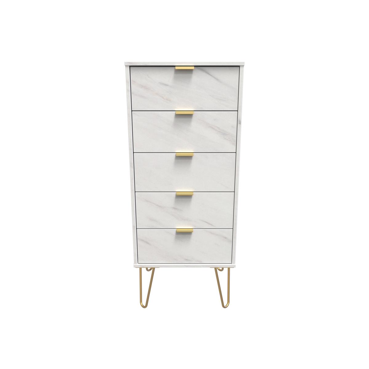 This 5 drawer chest of drawers is practical and stylish. Perfect for any home as a free standing storage unit. The modern, stylish Hong Kong range is available in a range of durable scratch resistant colour or natural wood finishes. With pull handles on all doors and drawers, with gold hairpin metal legs. All drawers come with long lasting metal drawer runners and a linen effect interior. All our furniture is made in the United Kingdom, to the highest quality. It is delivered direct to your location of choice by one of our two man delivery teams, and come full assembled (although legs may be removed to prevent damage in transit).