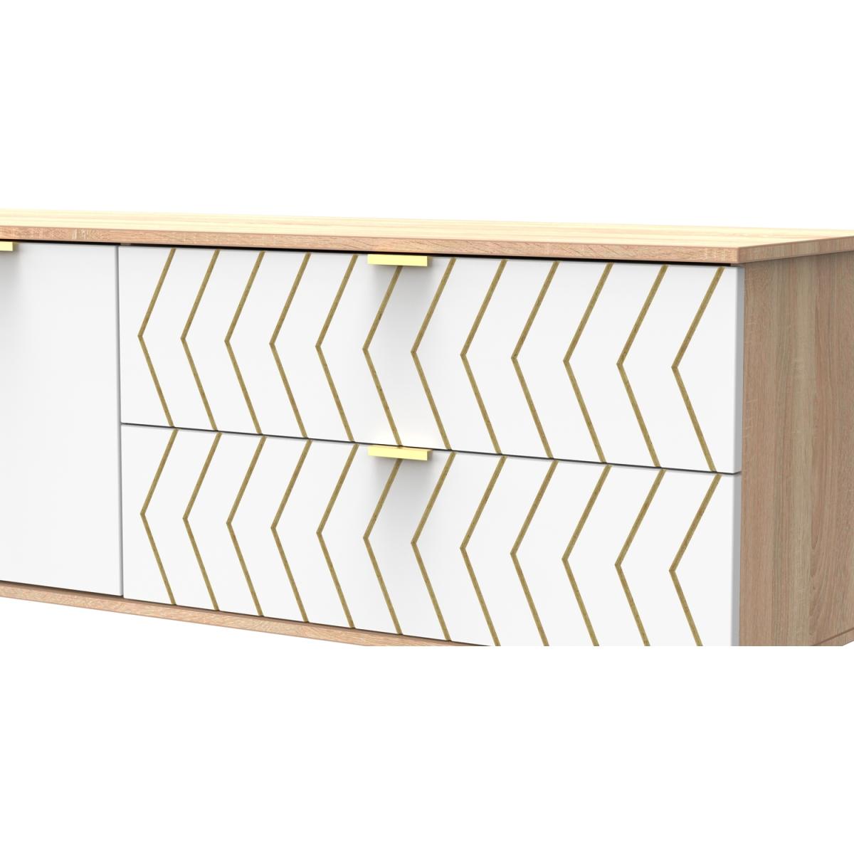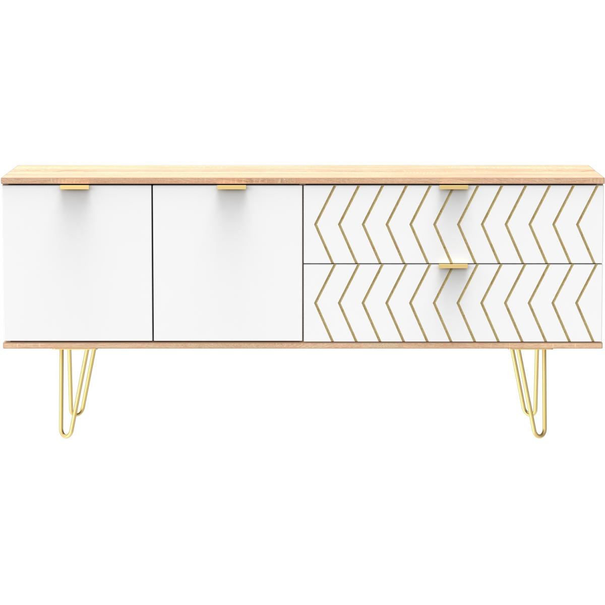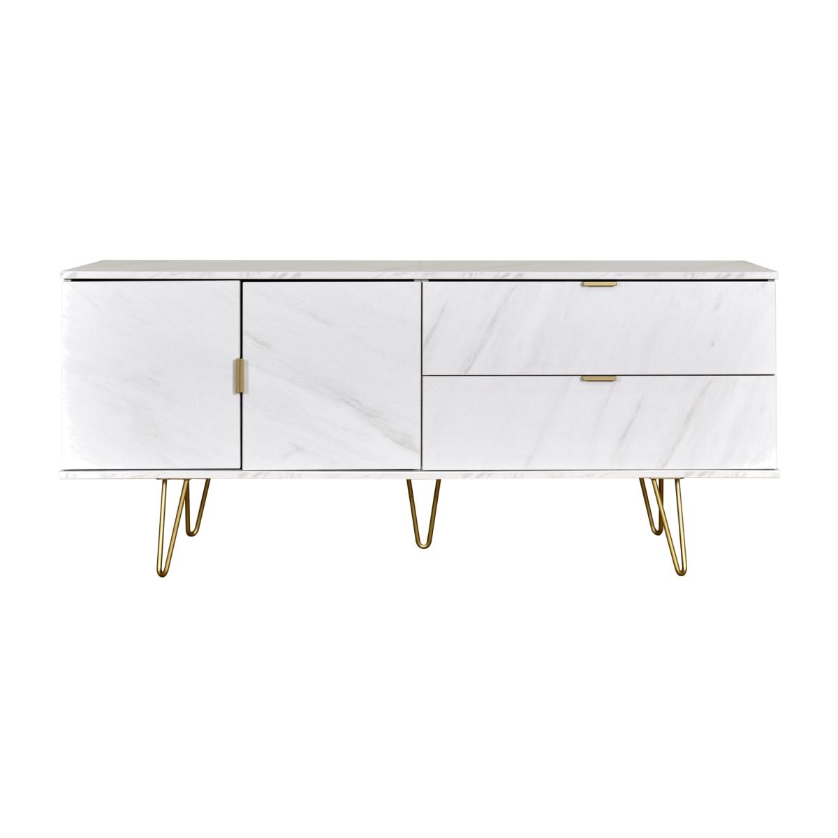 This modern wide sideboard features 2 storage drawers and a double door canbinet. The modern, stylish Hong Kong range is available in a range of durable scratch resistant colour or natural wood finishes. With pull handles on all doors and drawers, with black sleigh metal legs. All drawers come with long lasting metal drawer runners and a linen effect interior. All our furniture is made in the United Kingdom, to the highest quality. It is delivered direct to your location of choice by one of our two man delivery teams, and come full assembled (although legs may be removed to prevent damage in transit).