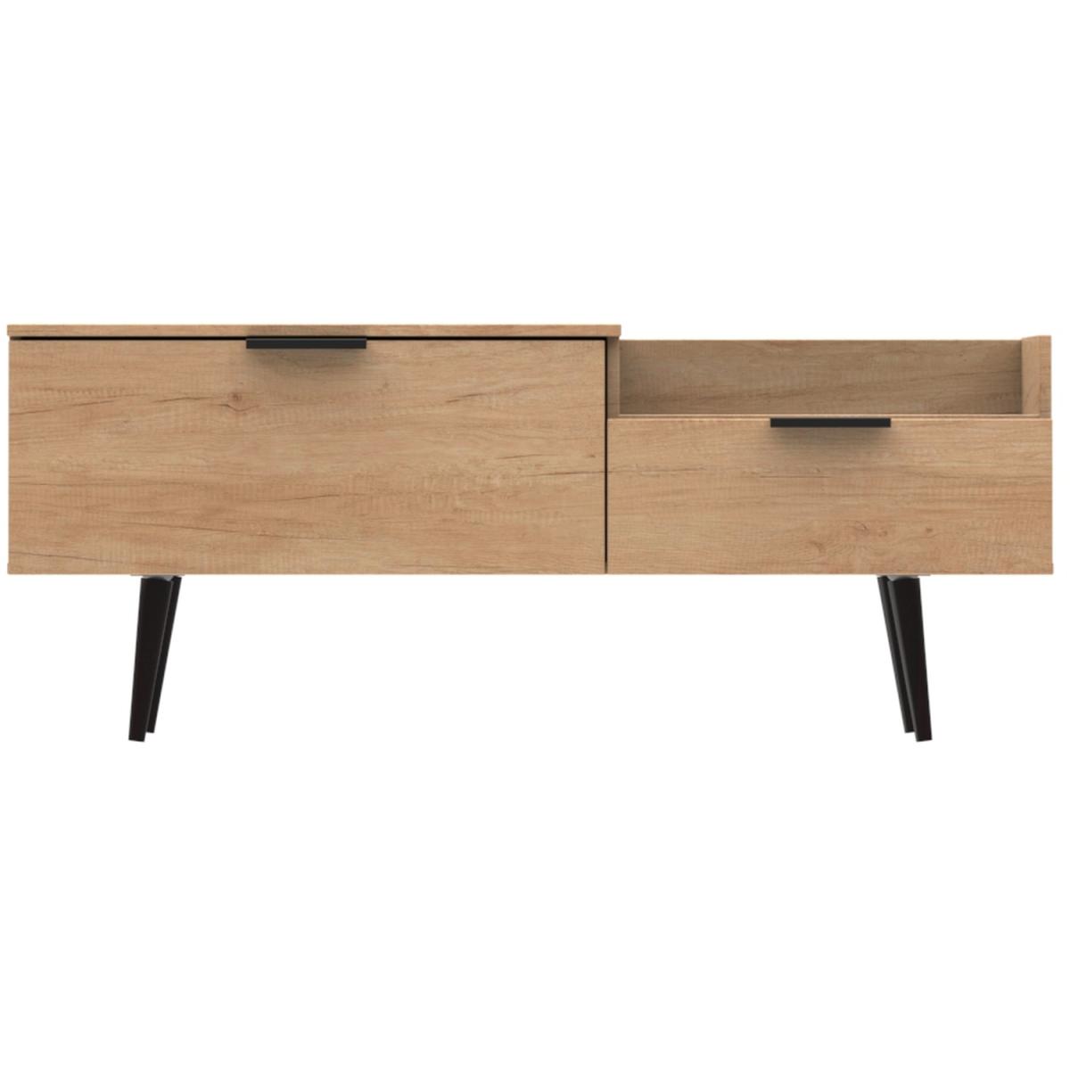This modern Console unit features a top surface with 2 different levels as well as 2 storage drawers of different depths. The modern, stylish Hong Kong range is available in a range of durable scratch resistant colour or natural wood finishes. With pull handles on all doors and drawers, with gold hairpin metal legs. All drawers come with long lasting metal drawer runners and a linen effect interior. All our furniture is made in the United Kingdom, to the highest quality. It is delivered direct to your location of choice by one of our two man delivery teams, and come full assembled (although legs may be removed to prevent damage in transit).