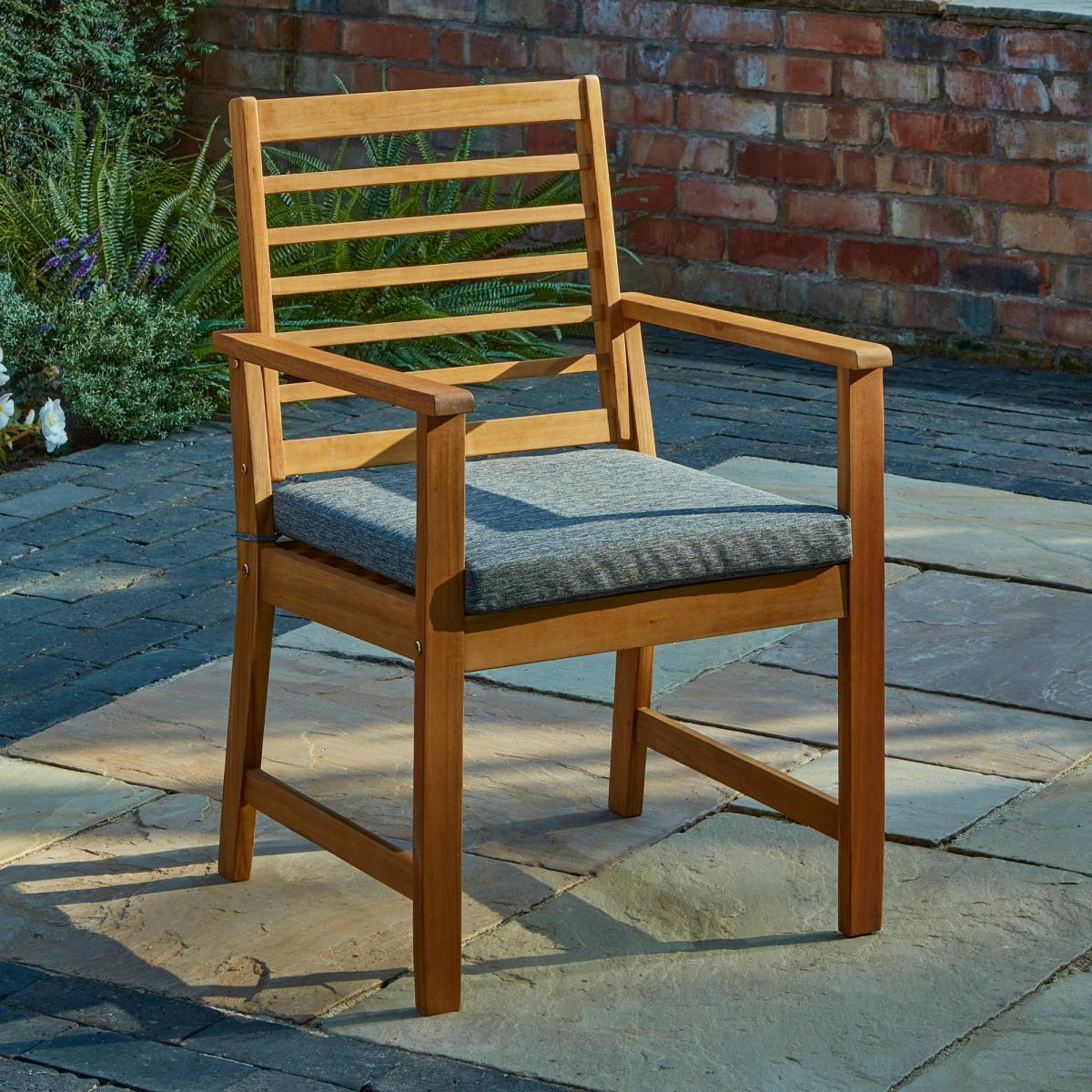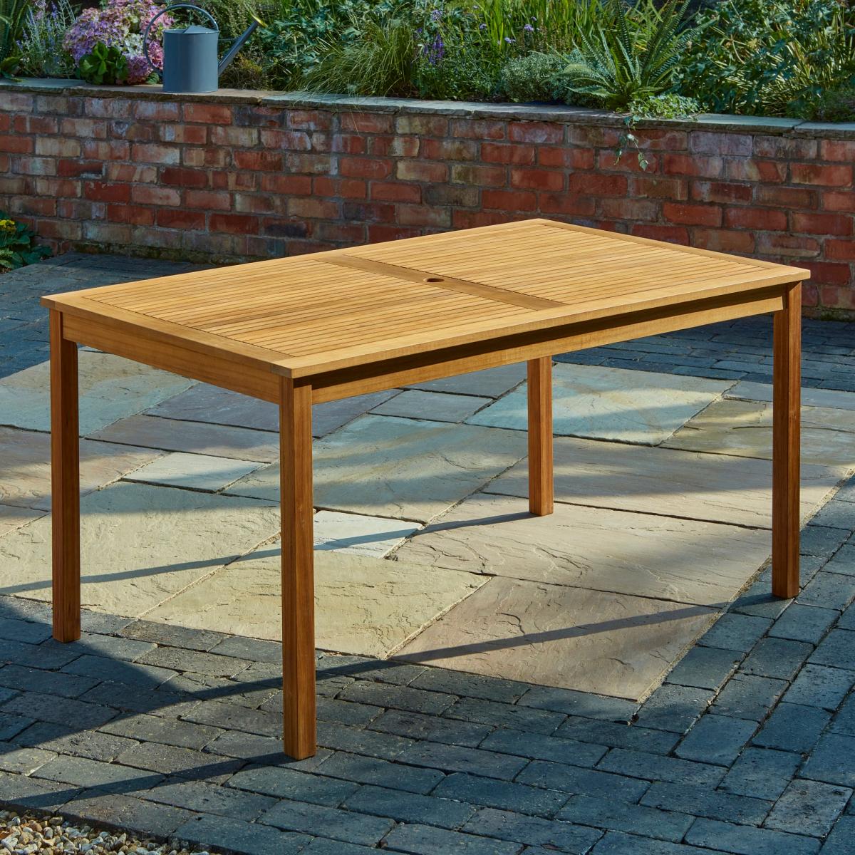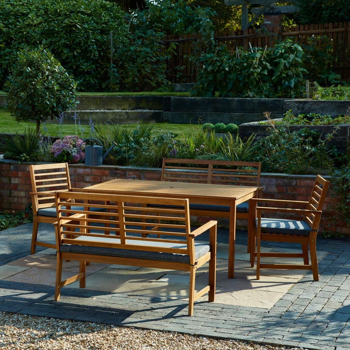 I love this garden dining set for its versatile, timeless appeal. The wood finish lends a classic look that works well in traditional and modern outdoor spaces alike. It's ideally suited for relaxed mornings or evening meals, making it a practical choice for any garden or patio. When styling, consider pairing it with neutral or earthy-toned cushions for extra comfort and a splash of colour, or integrate outdoor lighting and planters nearby to create a cosy dining atmosphere. It's a sturdy, durable piece that can handle outdoor elements, and it looks equally stylish when paired with casual textiles or elegant tableware, allowing you to adapt it to different occasions and seasons.