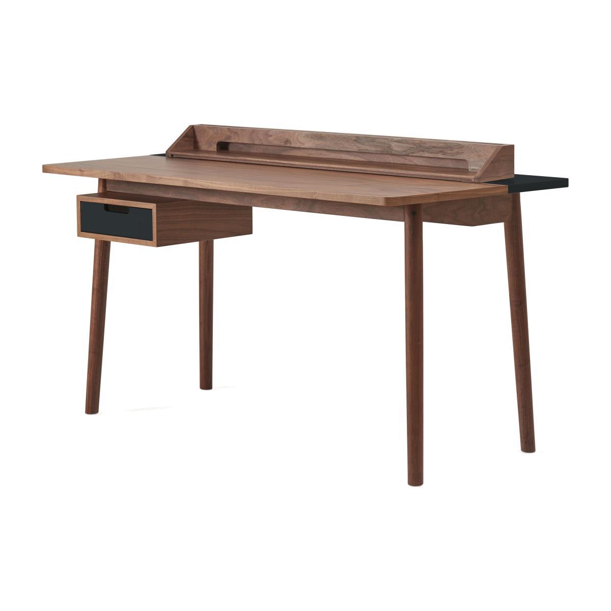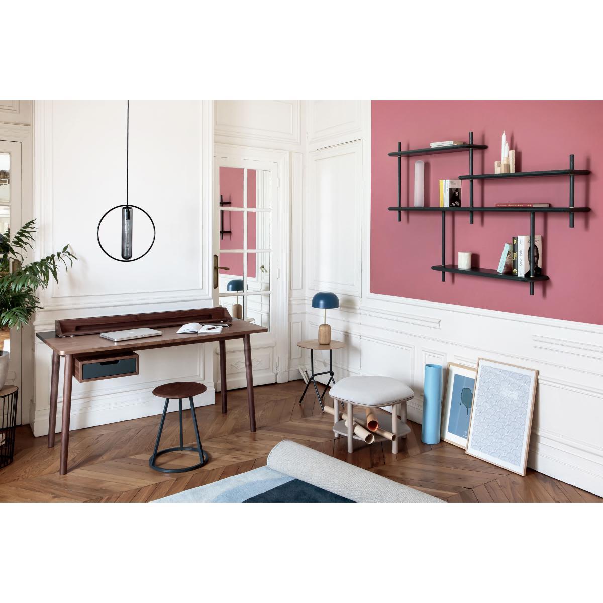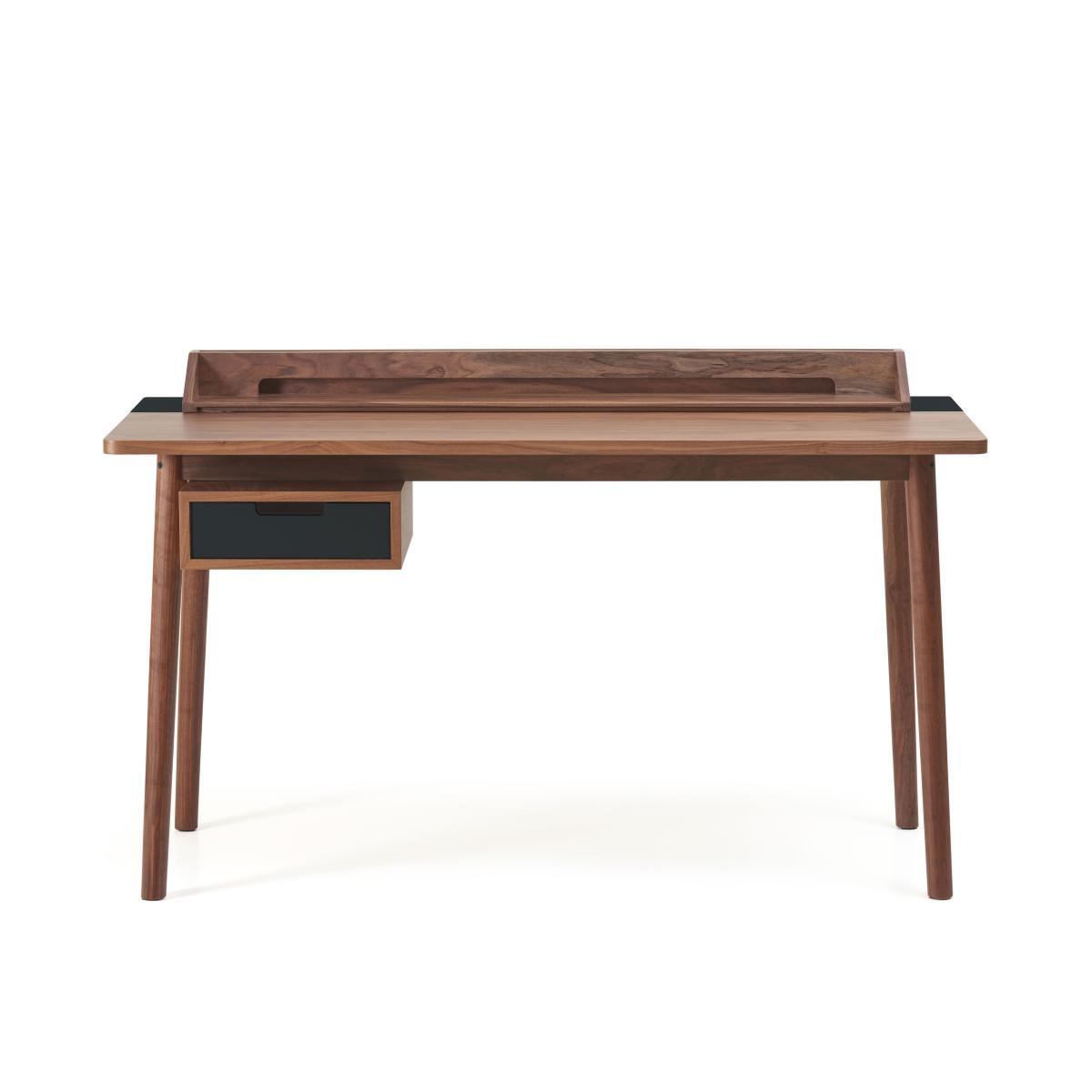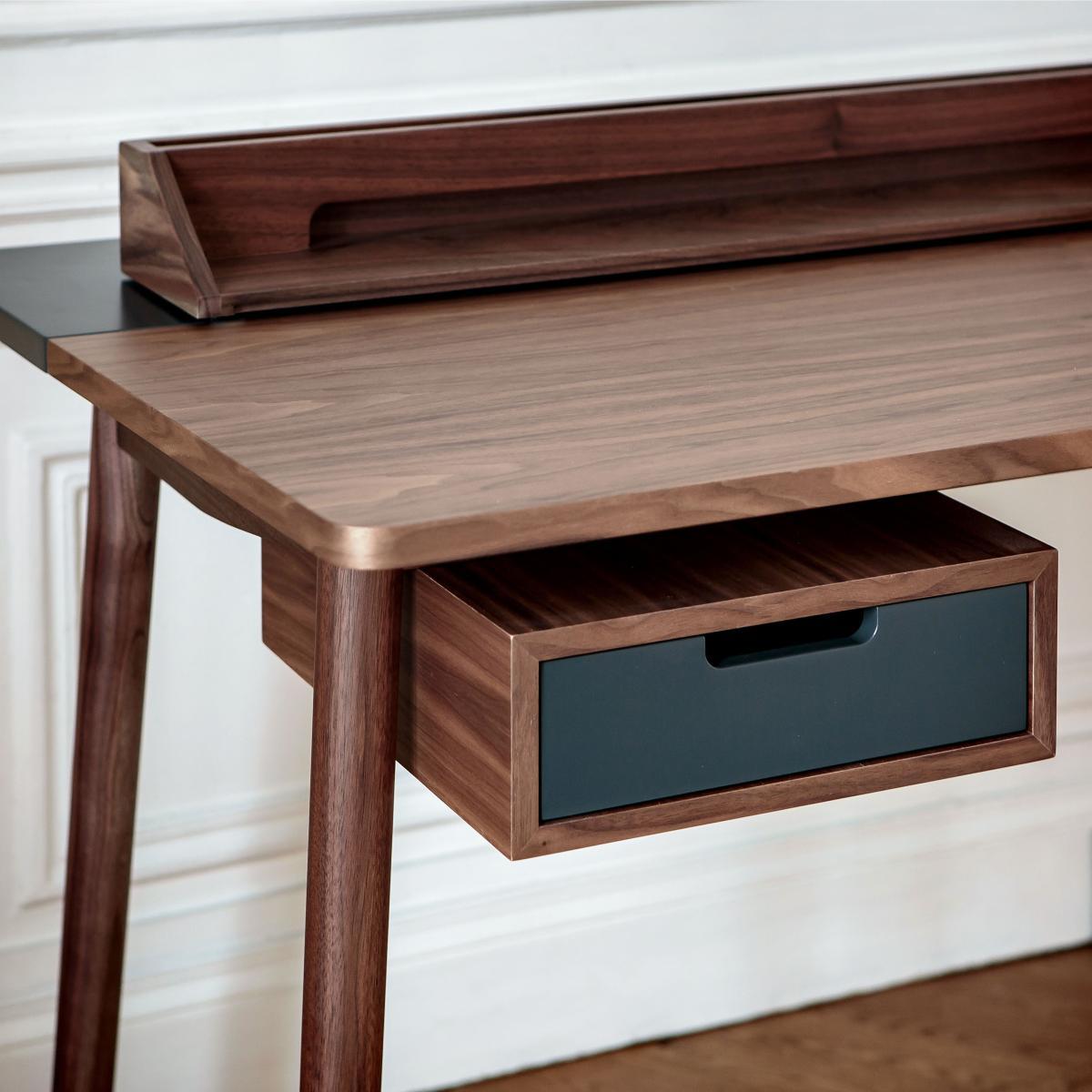 "A retro style and Scandinavian perspective, great practicality: Honoré has it all! This walnut desk with clean lines has a very contemporary presence via the colour which decorates the drawer and the back of the work top. The long reading desk on the top will welcome your letters, books, photos frames and pens. You just need to push up the reading desk on the back of the work top to discover, under the top, a secret compartment letting you hide everything you don't want to show. This very practical compartment lets you hide unsightly cables and chargers to keep the clean look of the desk. Two holes located in the inner compartment allow power cables through for all the digital devices connected to a socket (chargers, laptop, etc. ). The drawer is equipped with a decelerator. It can be placed to the right or the left during assembly. The young French designer, Pierre-François Dubois, designed the Honoré desk as ""a practical, comfortable and discreet work space"". ".
