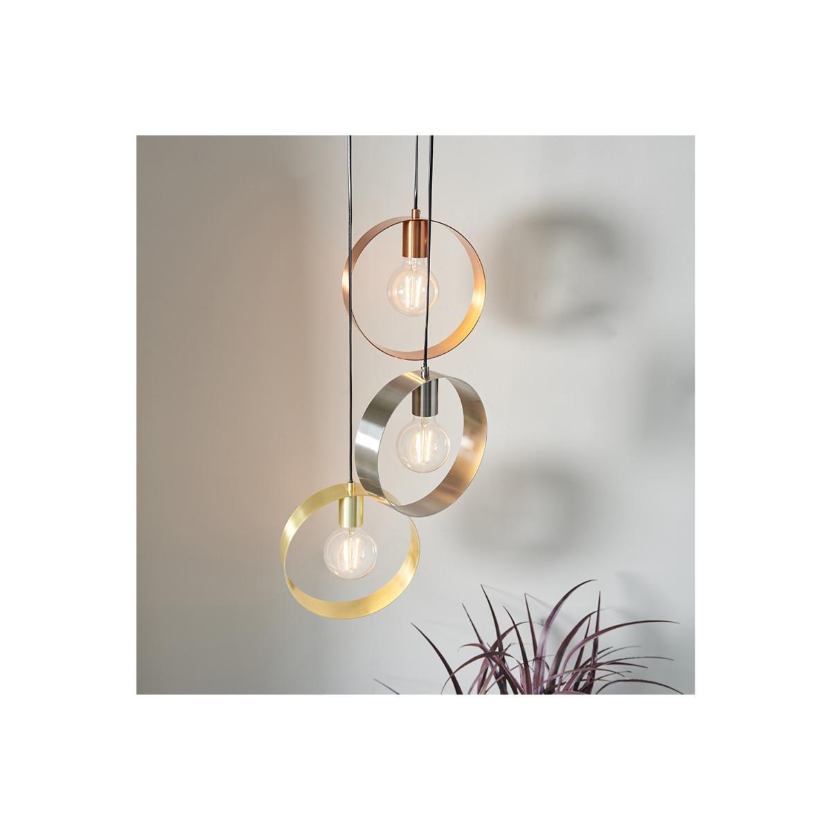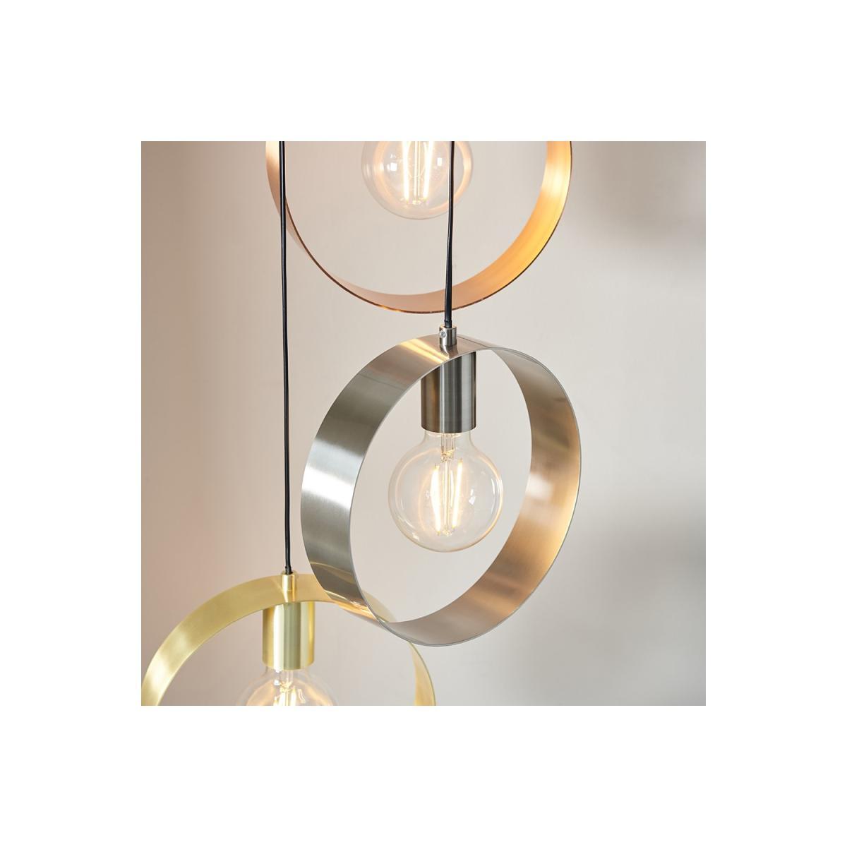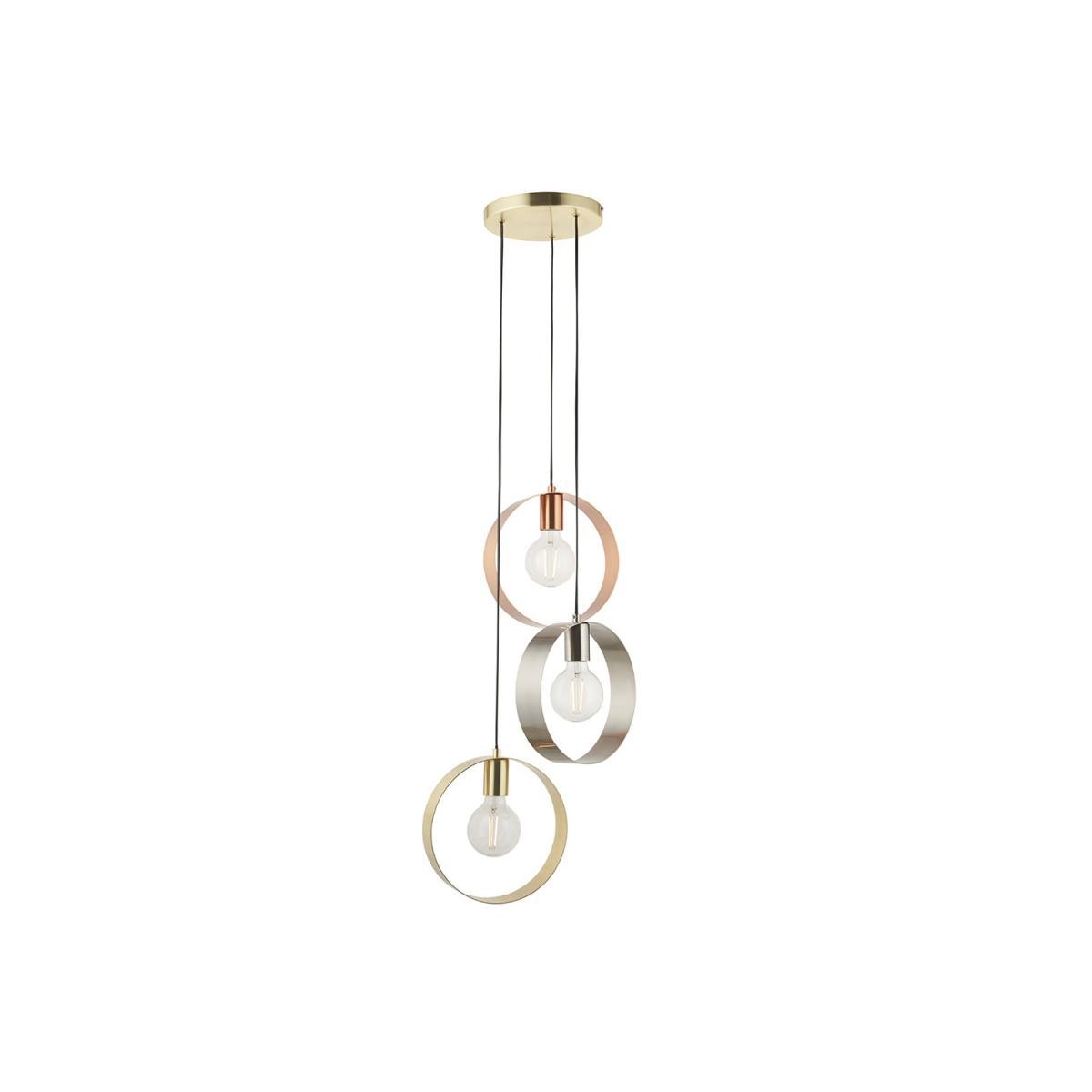 Dimensions H200cm x W45.6cm x D25cm. The perfect 'must have' multi pendant light. The mixed plated finishes and open hoop design make this bang on-trend with a fun contemporary aesthetic easily placeable in today's modern homes. Pair with LED filament lamps to complete the look. Features. Brushed brass ceiling cover with a mix of plated hoops in brushed copper brushed nickel and; brushed brass finish. Contrasting design Height adjustable at point of installation. Perfect statement light to brighten up your living space Contemporary design style Twin with E27 LED filament lamps for that unique 'on trend' look. Assembly not required..
