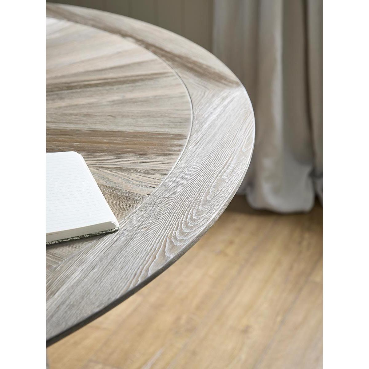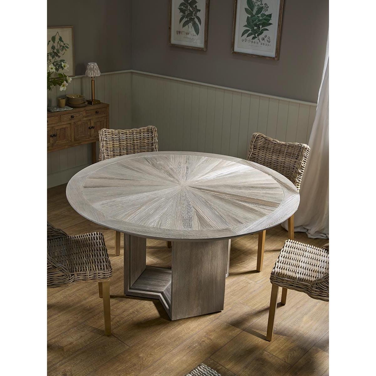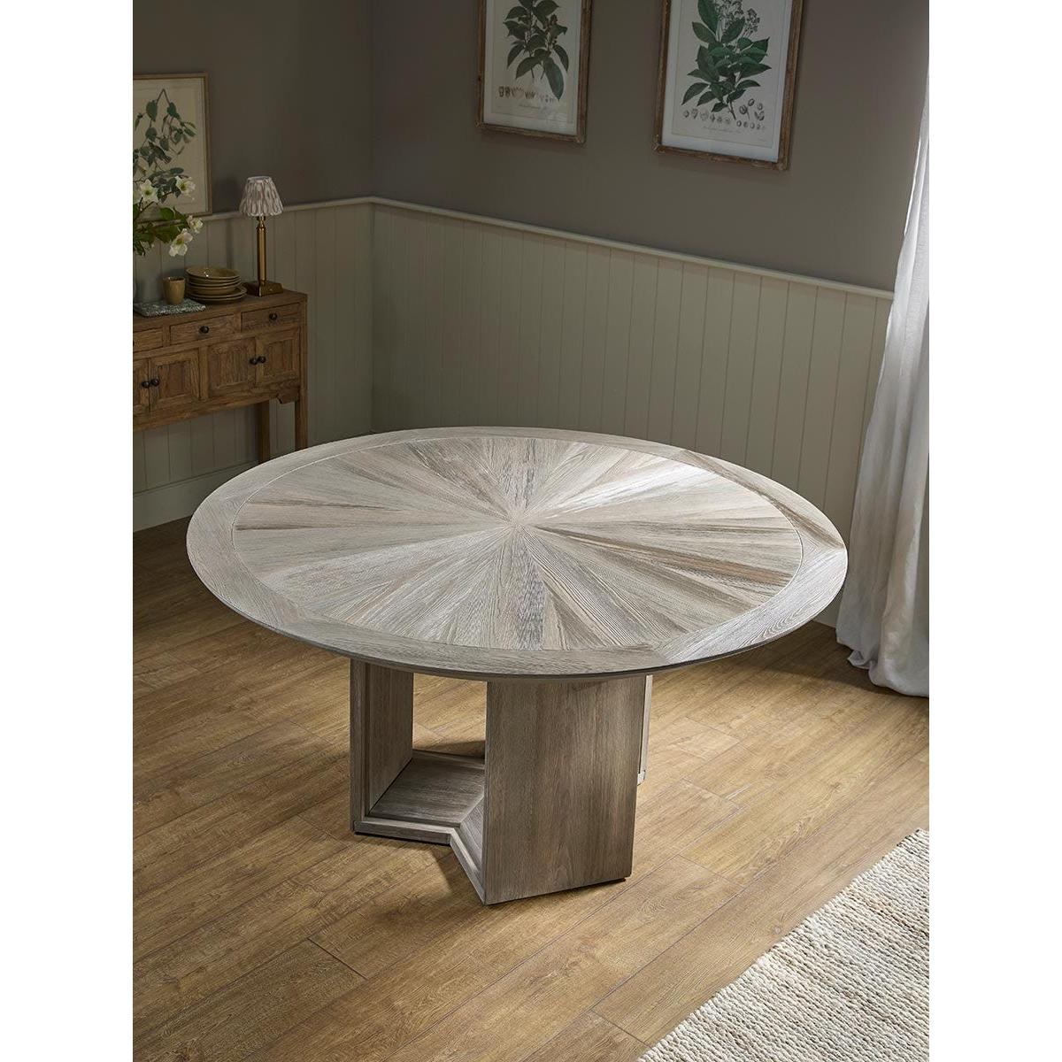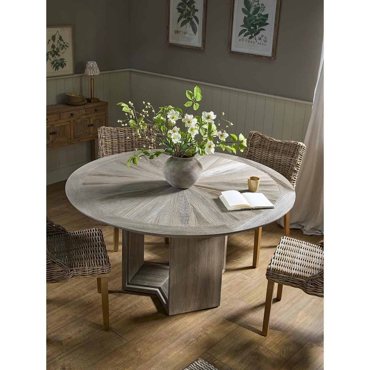 Perfect for your kitchen or a smaller dining space, our circular Hoorn Dining Table is handmade from pine, with a light, washed finish that shows off the natural patina of the wood beautifully. With three chunky legs that form a 90-degree angle and connect at the bottom, this table has a structured look, fitting wonderfully within our English Rustic trend.