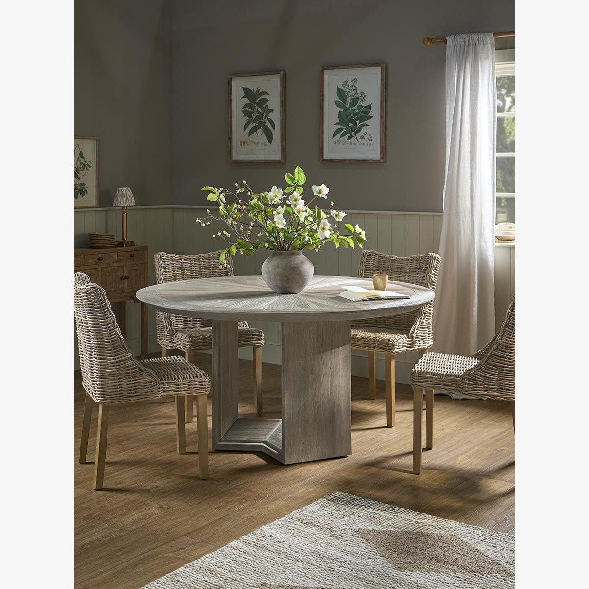 I really like the Hoorn table for its sturdy yet elegant design, making it a versatile piece that balances practicality and style. Its clean, neutral tones work well in both modern and rustic interiors, especially those with a relaxed, natural aesthetic. I recommend pairing it with woven or rattan chairs, as shown in the image, to enhance a cohesive, laid-back vibe. Practical styling tips include adding a statement centrepiece, like a simple vase of fresh flowers, and keeping the surroundings minimal to let the table stand out. This table is great for family gatherings or entertaining, and can adapt easily to both casual and slightly more formal dining spaces.