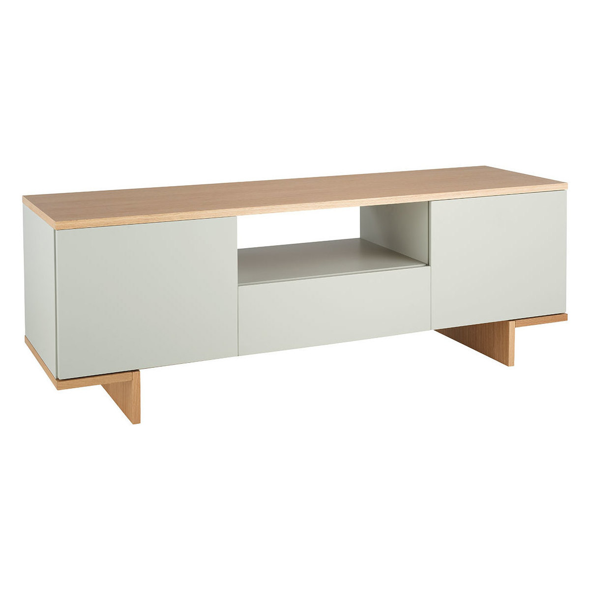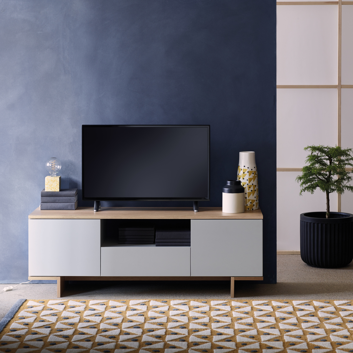 I really like this media unit for its versatile look, blending the classic oak finish with a contemporary grey base. It works well in modern, Scandinavian, or even eclectic interiors where you want a practical yet stylish piece. The open shelf adds functional storage for media devices, while the spacious top can accommodate both a TV and decorative items. Styling tips would include layering with textured accessories or a stack of books to add visual interest, and pairing with neutral or pastel colour palettes to keep the overall look light and fresh. Its clean lines and neutral tones allow it to sit comfortably in various colour schemes, making it an easy and stylish addition to your living room.