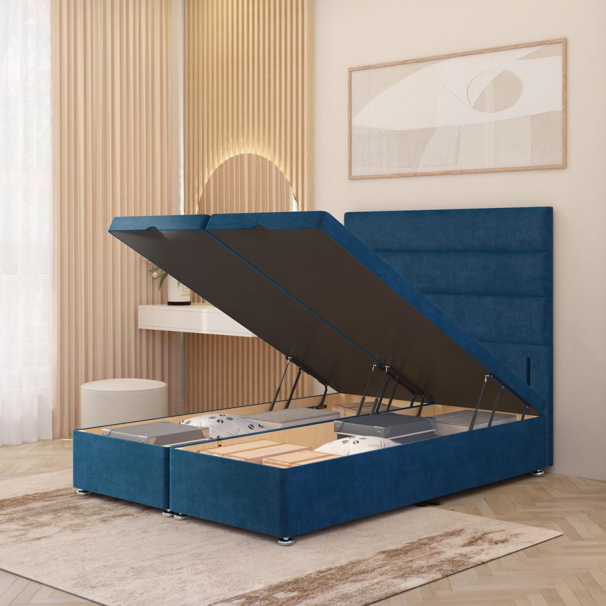 The Horizona Plush Velvet End Opening Ottoman Divan Storage Bed Base with 54" Floor Standing Upholstered Headboard combines timeless style with lasting support. Featuring a solid, non-slip platform base. A solid top base provides a firm, stable surface for your mattress, eliminating the bouncy feel and poor edge support often experienced with slatted bases, allowing your mattress to benefit you to its full potential. The matching headboard is crafted with soft, cushioned horizontal panels, with hand finished upholstery for stunning appeal as well as comfort when sitting up in bed. Base Height 34.5cm or 37.5cm with gliders attached (base can be used with or without gliders). Internal storage dimensions vary by bed size, typically 4-6cm smaller in length and width than the total bed size. All ottoman beds provide 24cm of discreet under bed storage, easily accessed with smooth, gas-assisted end-lift pistons (600N800. N depending on size). Perfect for modern spaces, this UK-made ottoman bed meets all British safety and quality standards. 2FT. 6 and 3FT ottomans arrive as one base piece, and have one storage compartment, 4FT and above arrive as 2 pieces and thus have two separate storage spaces. Total headboard height from the floor is 54" 137cm, the front panel of the headboard is 34" 86cm. 3FT Ottoman Bed, L 193cm x W 92cm