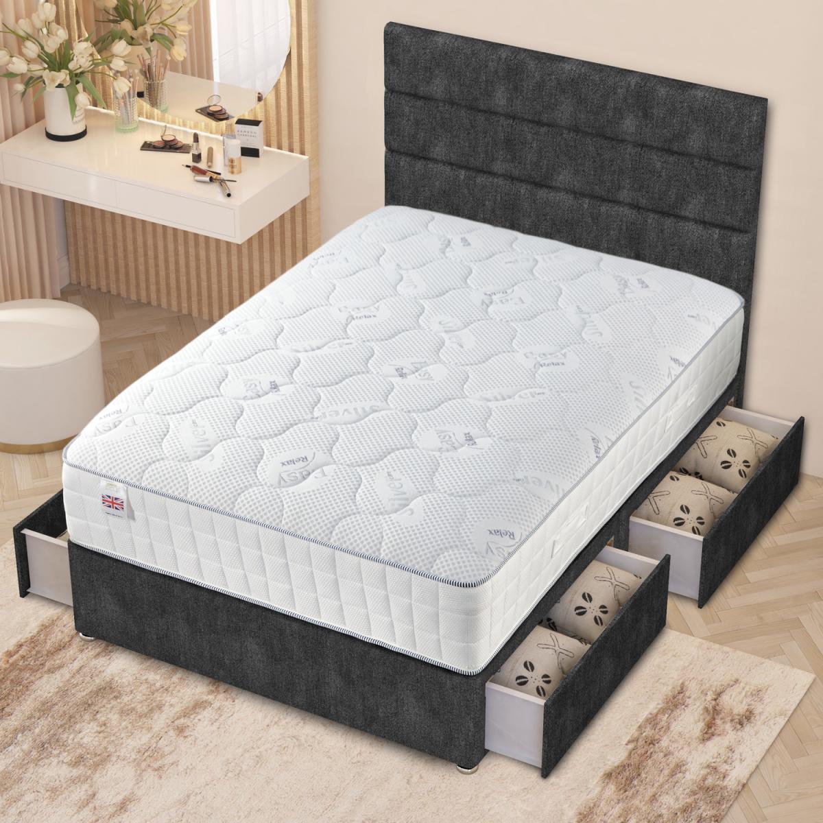The Tweed Fabric Horizona Divan Bed Set blends refined design with lasting comfort. Handcrafted in the UK, it includes a solid platform-top divan base, a premium 5-layer Easy Relax Pocket Spring Memory Foam Mattress, and a 54" floor-standing headboard upholstered in elegant tweed fabric. The 1000 pocket springs and three foam layers - 2.5cm memory foam, 2.5cm reflex foam, and 750g polyester foam - deliver medium-firm cushioned support that contours to your body while maintaining bounce-back comfort. Firmer edge springs enhance stability, and the 7-zone system targets shoulders, hips, and back for improved posture and pressure relief. Finished with a quilted soft-touch knitted cover, the mattress provides even, breathable comfort for deeper, undisturbed sleep. The matching 54" floor standing headboard, with its horizontal cushioned panels, adds a statement of luxury to any bedroom. Available with no drawers, 2 drawers (same side), or 4 drawers, all with mattress included. Base height: 34.5cm with gliders, 30.5cm without. This storage bed comes with 4 easy access storage drawers, 2 on each side.